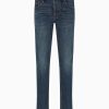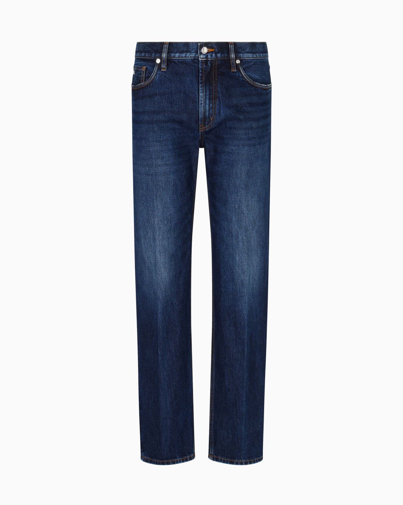 Five-pocket jeans featuring a regular waist, straight leg, comfortable rise and zip closure. The particularly rigid weave is treated with an enzyme stone wash that creates a distinctive worn look on the canvas, with characteristic refined front ribs.