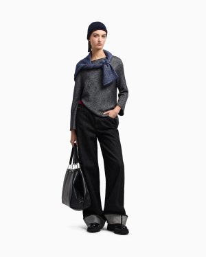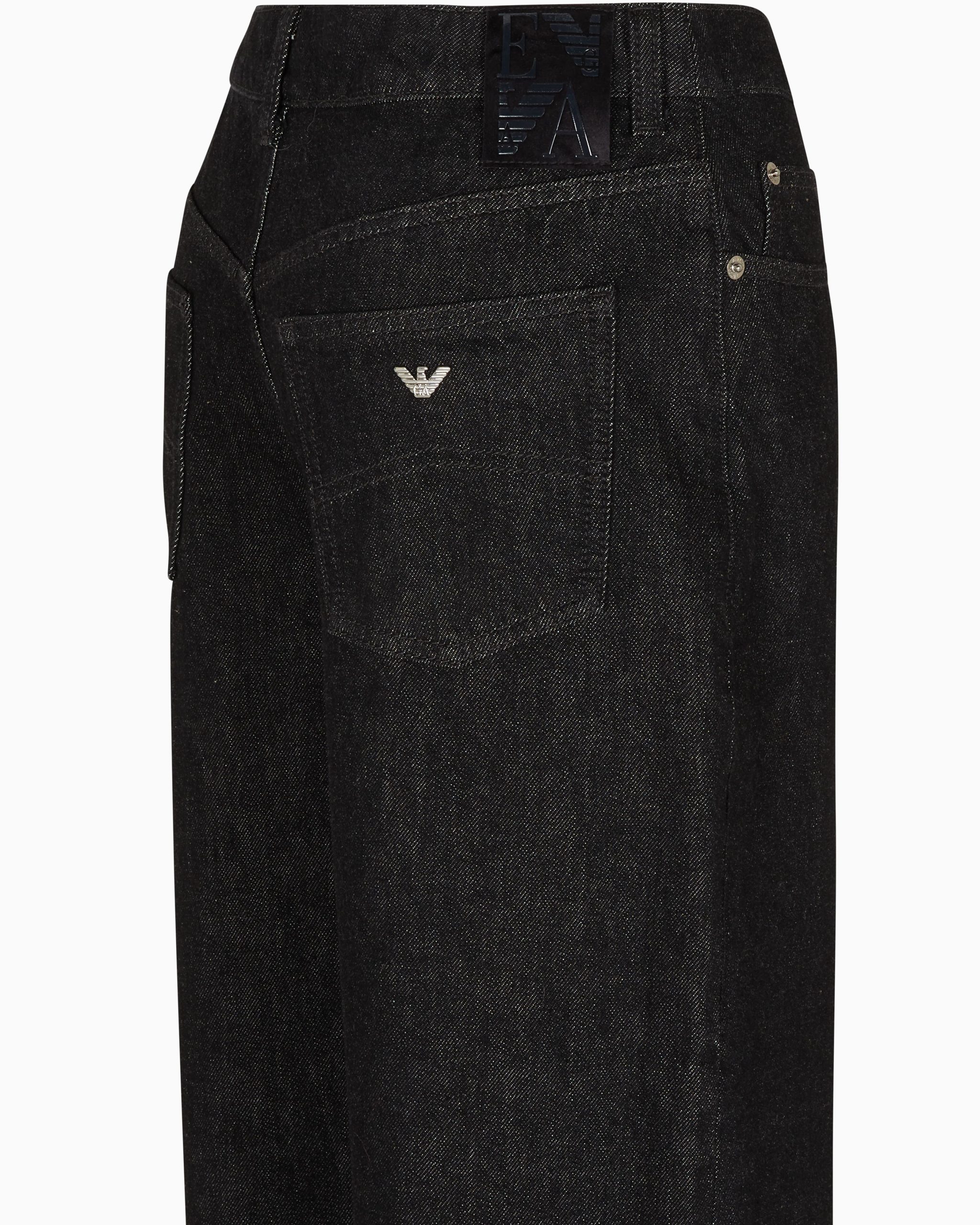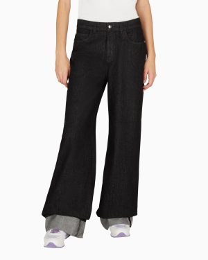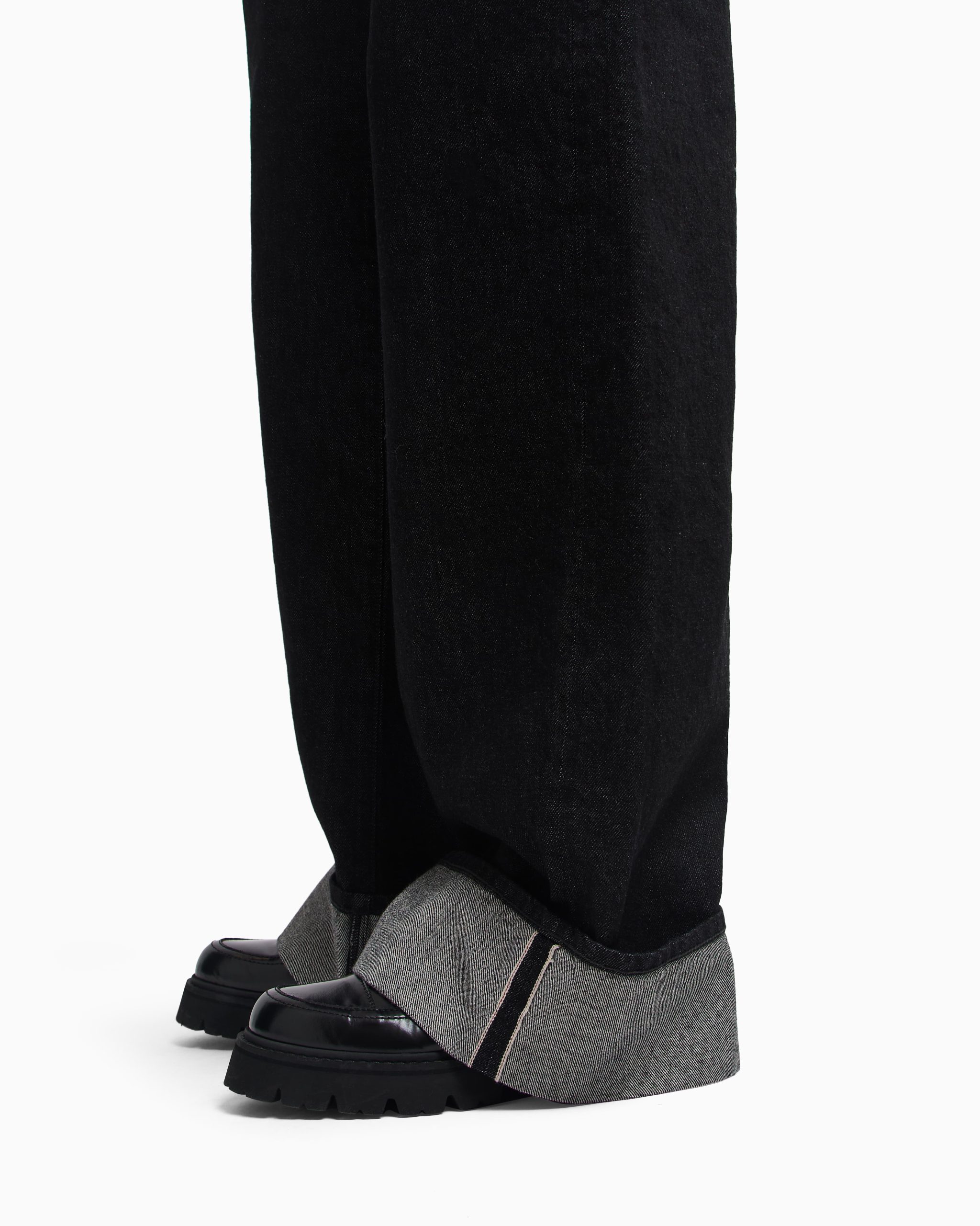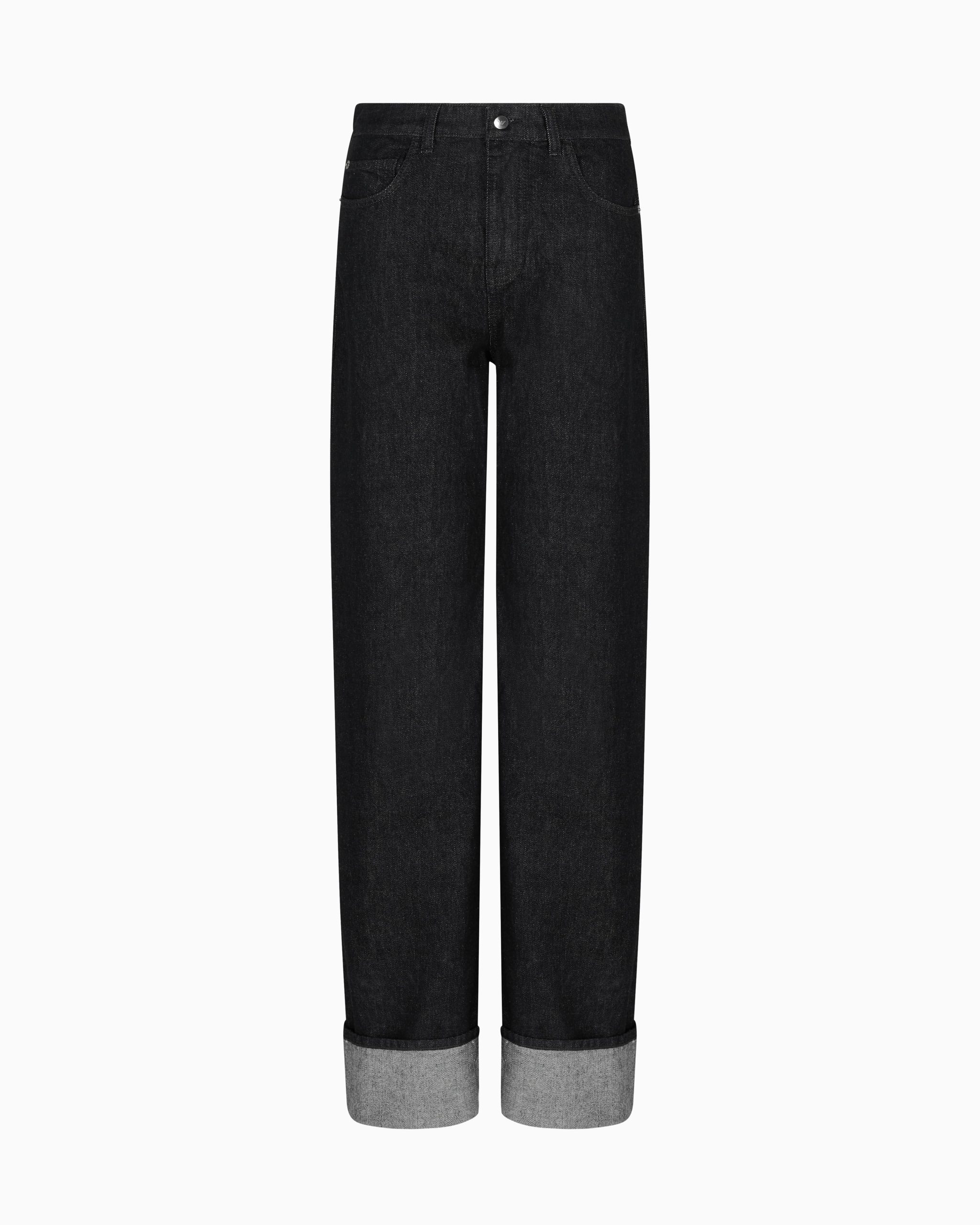 Cotton denim, comfortable-fit five-pocket jeans. The wide, straight-leg style features a fixed turn-up at the hem and a rubberised logo patch at the back. Relaxed fit. The piece belongs to the Winter Urbanism capsule collection, a selection that reinterprets the volumes and shapes of the winter wardrobe with an essential take. The urban spirit is expressed through clean, minimalist lines, enriched by the sophistication of the materials that are snug and warm to the touch.