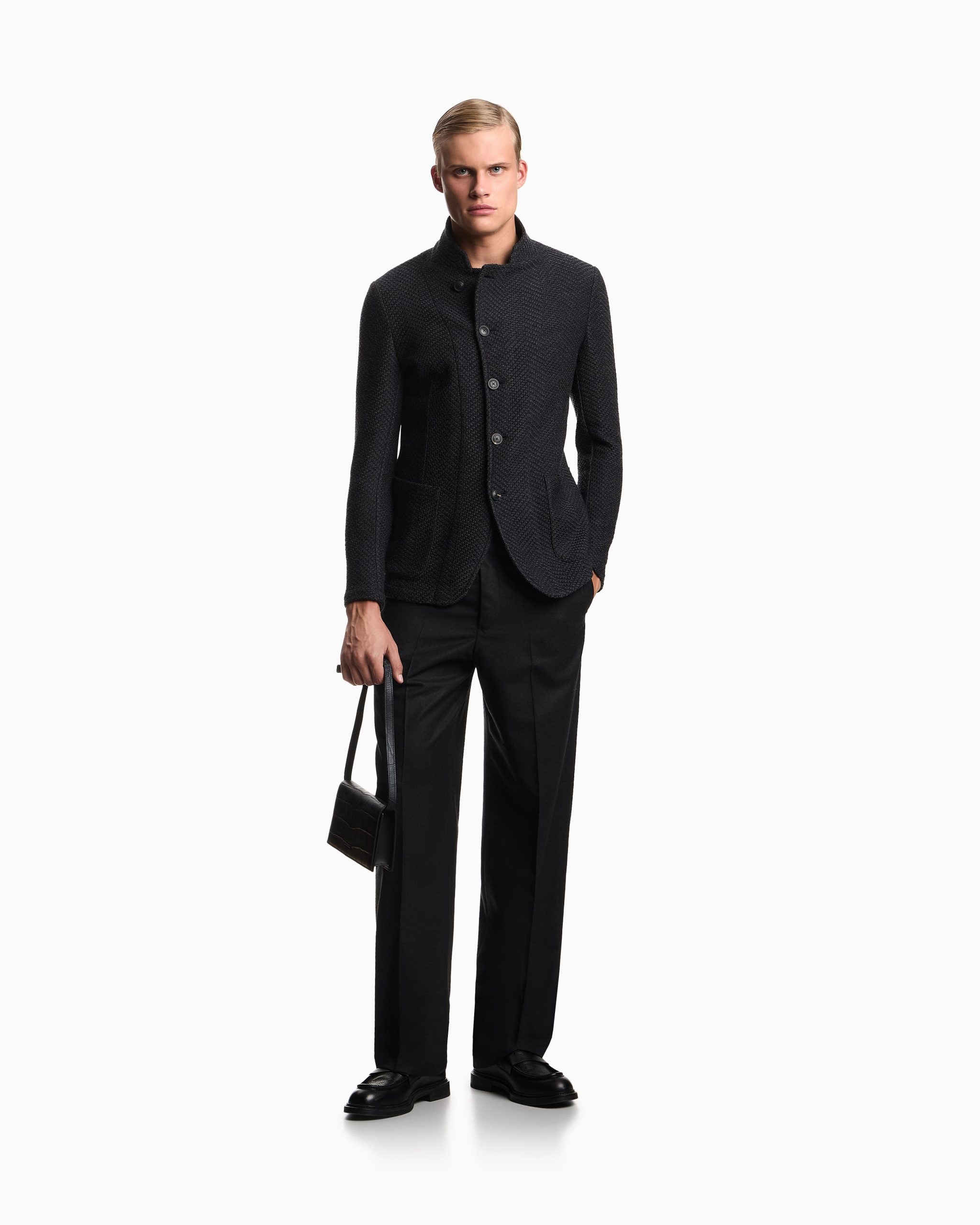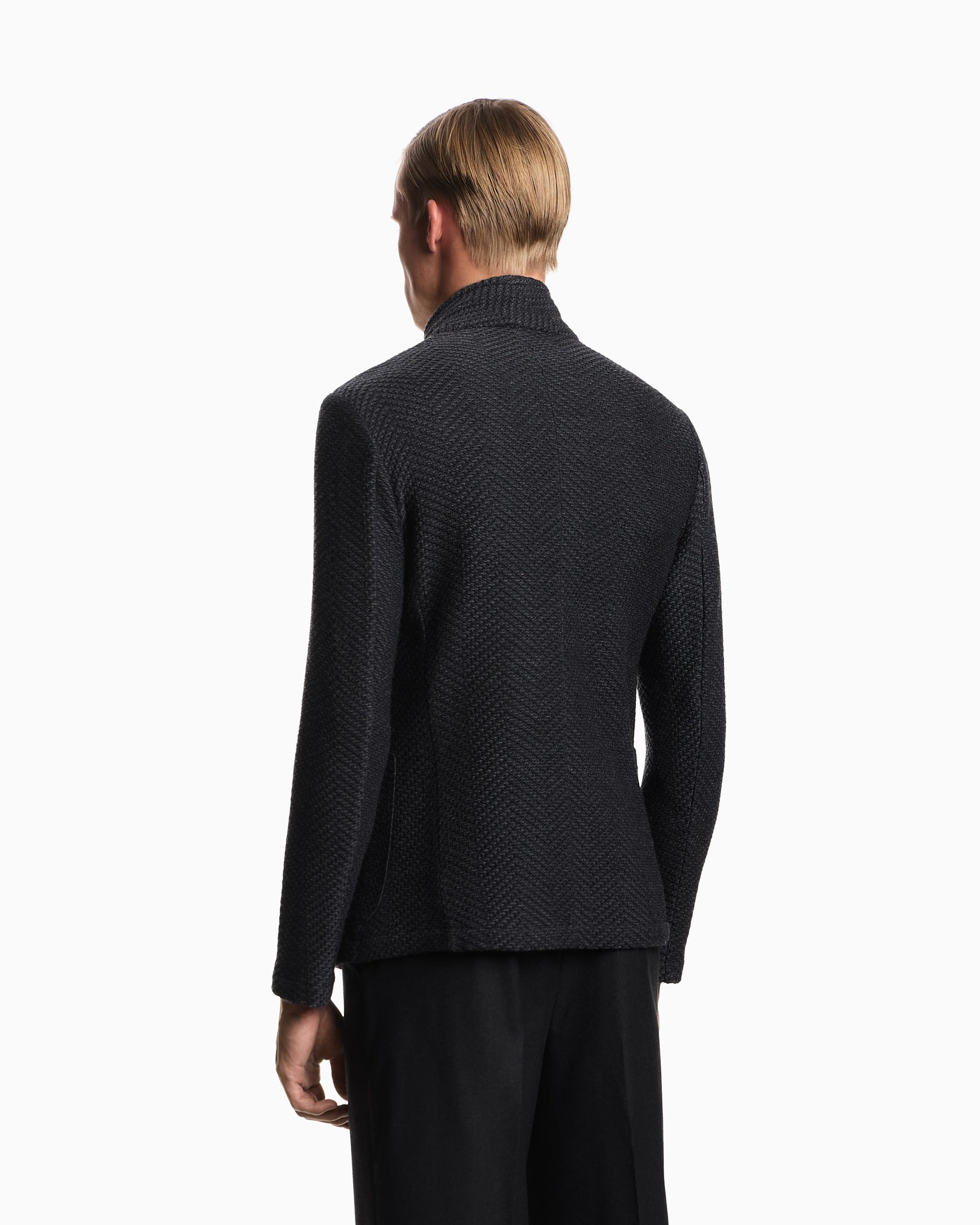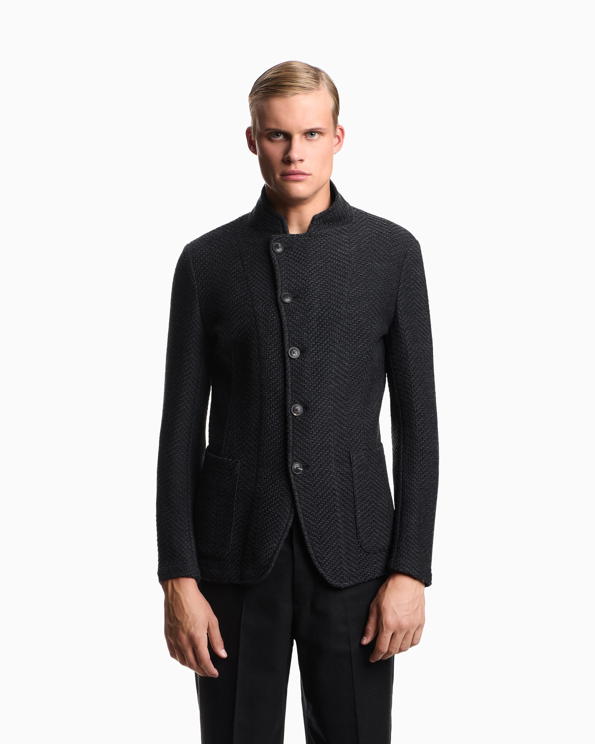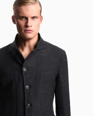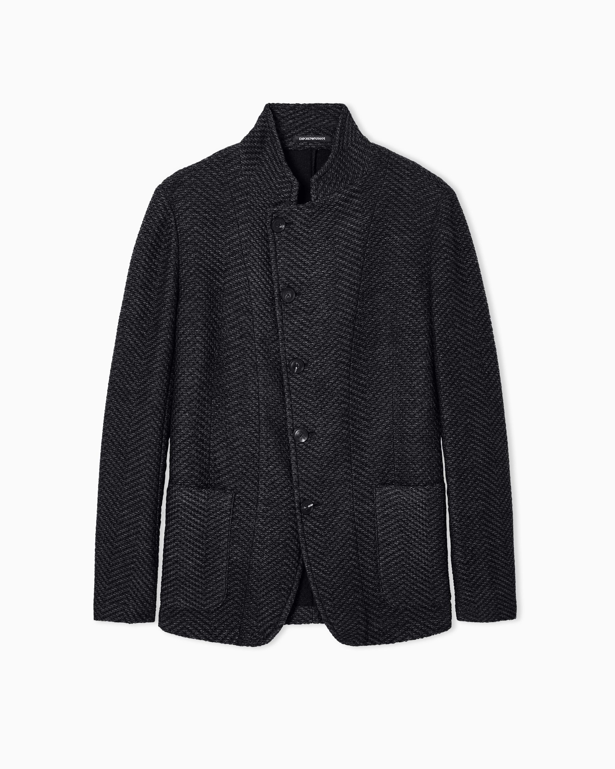 Jacket with a hallmark guru collar, off-centre button fastening and slim lapels at the neckline when not fully closed. Made of wool with a knit effect featuring the all-over iconic chevron motif. The piece is part of the Icon Autumn/Winter 2025 capsule collection.