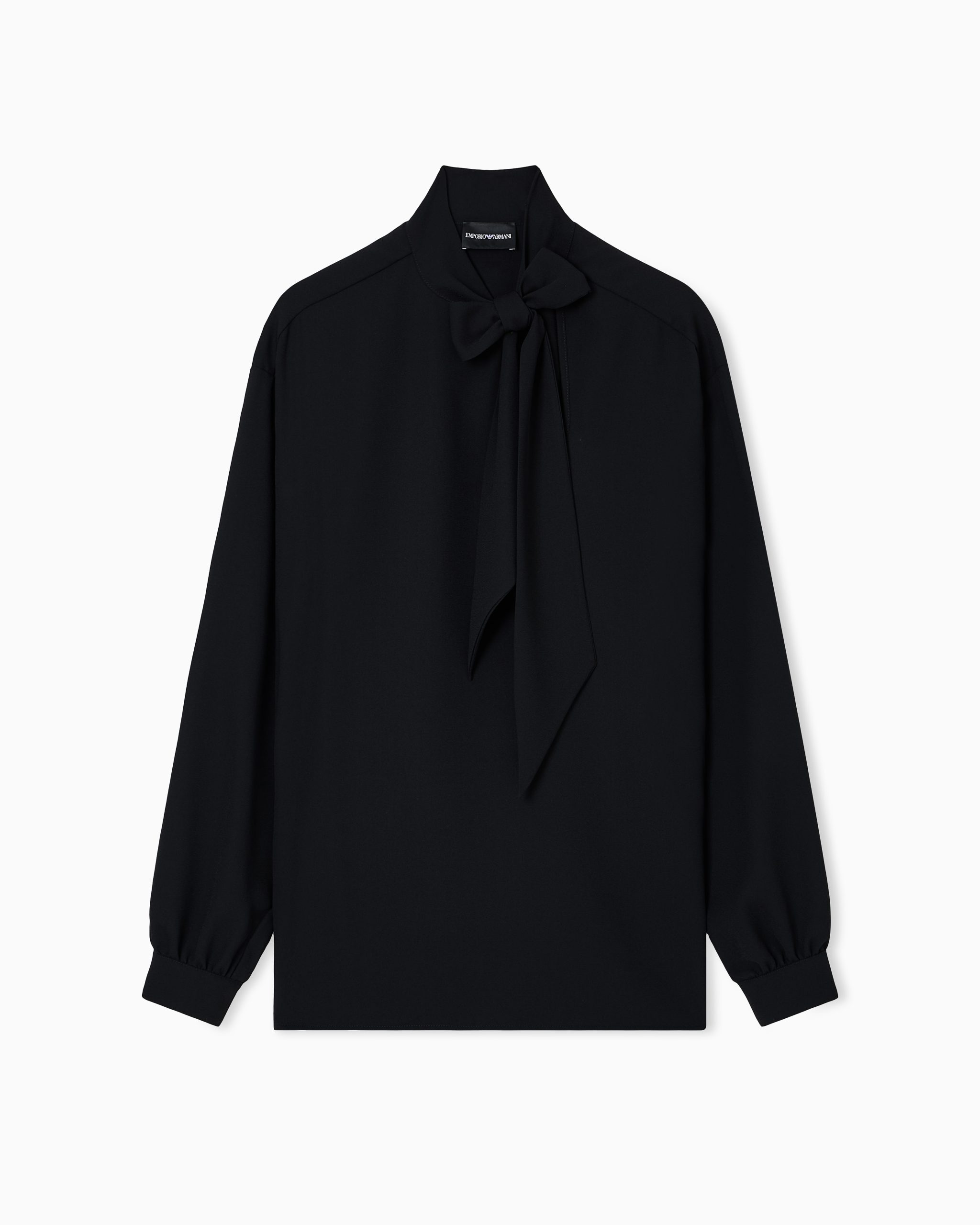 Blouse with flared hem made of fluid crêpe that takes on an ultra feminine style that will add an elegant touch to any outfit. The distinctiveness of the piece comes from the foulard collar with flaps that can be knotted to create a sophisticated decorative bow at the front.