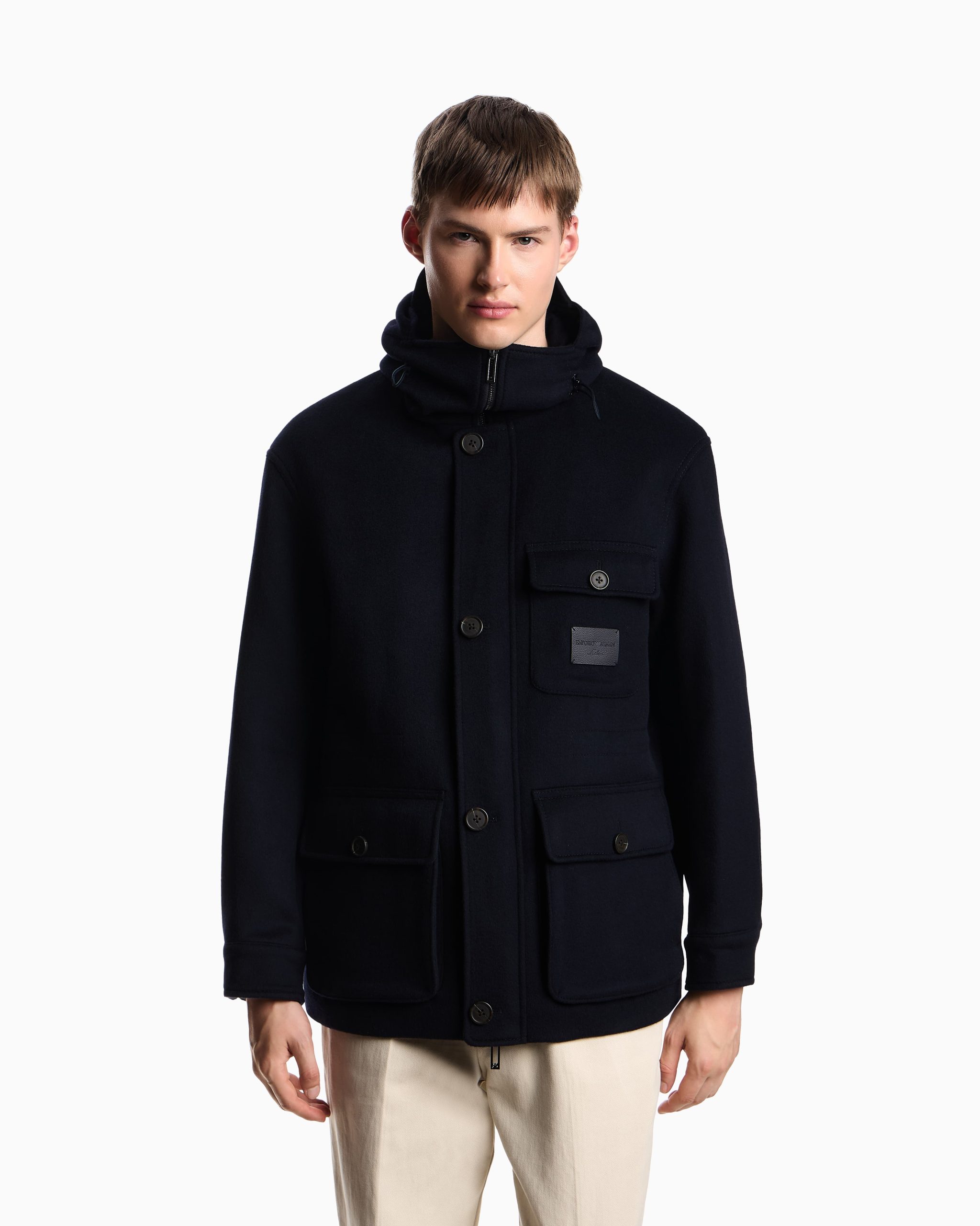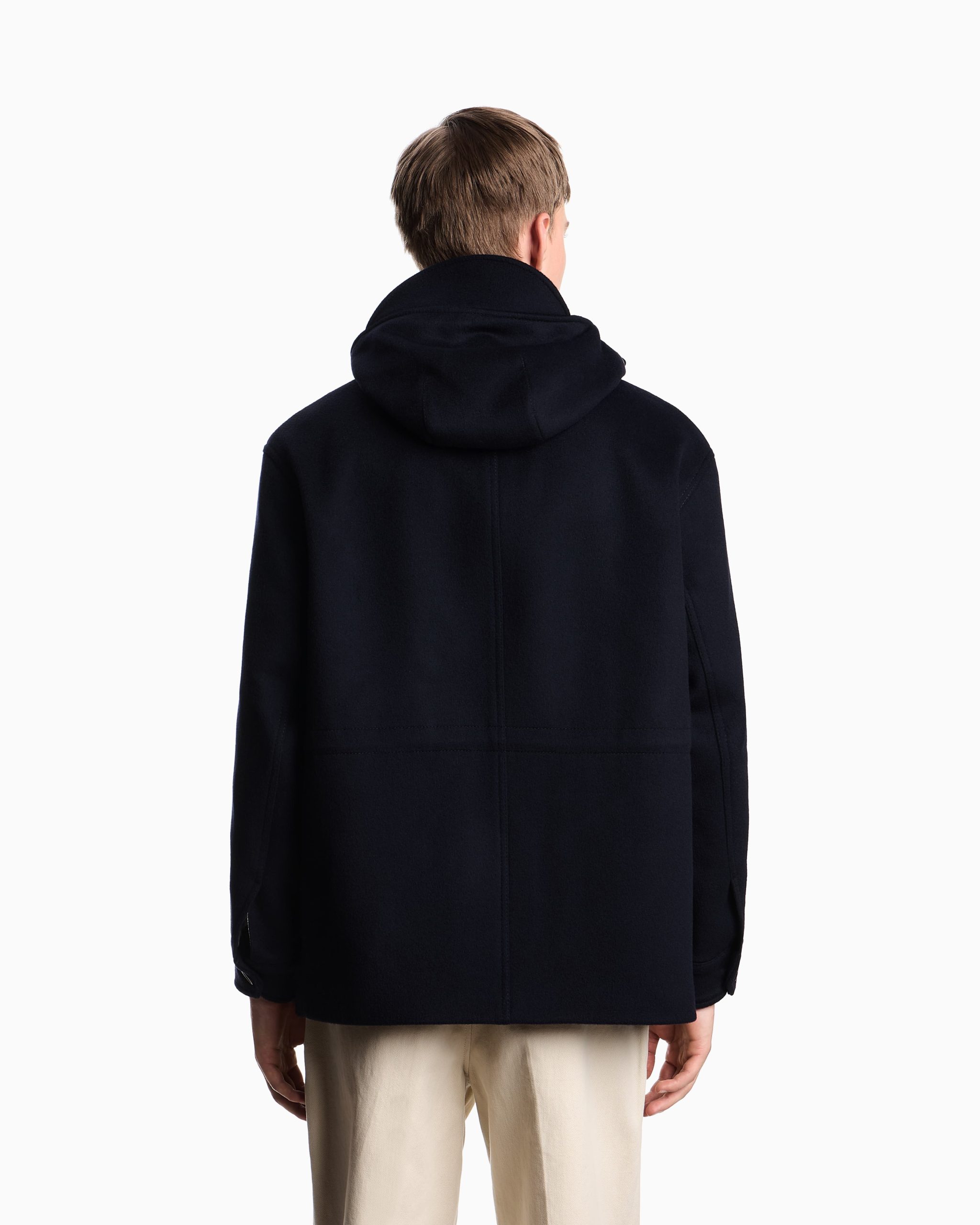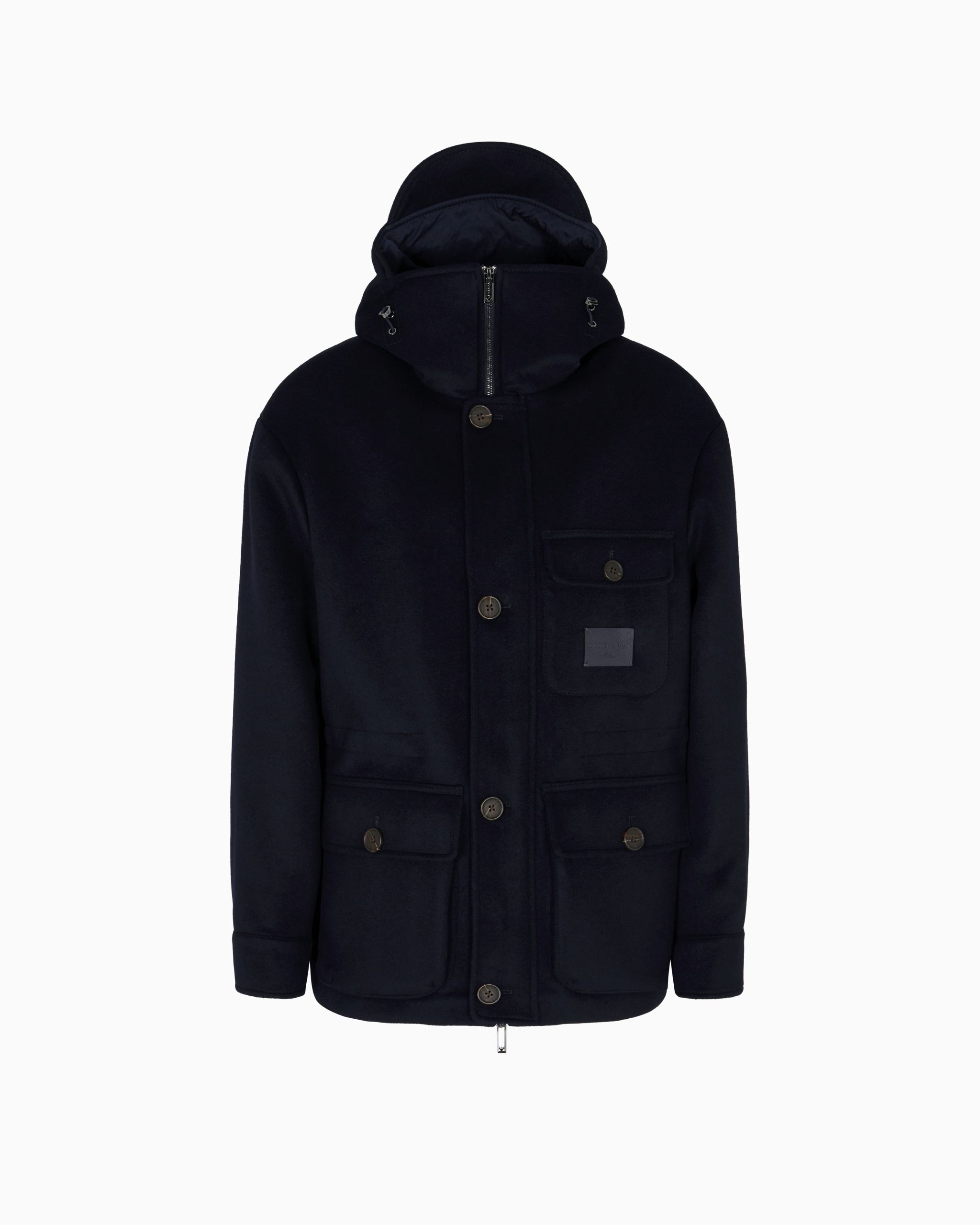 Blouson with hood and contoured visor, with a full-zip and front button fastening. The piece is made from virgin wool cloth with a small percentage of cashmere that makes it feel softer. A multi-pocket design, finished with a crinkled nylon inner lining and practical inner waist pulls that lends itself to everyday and city looks.
