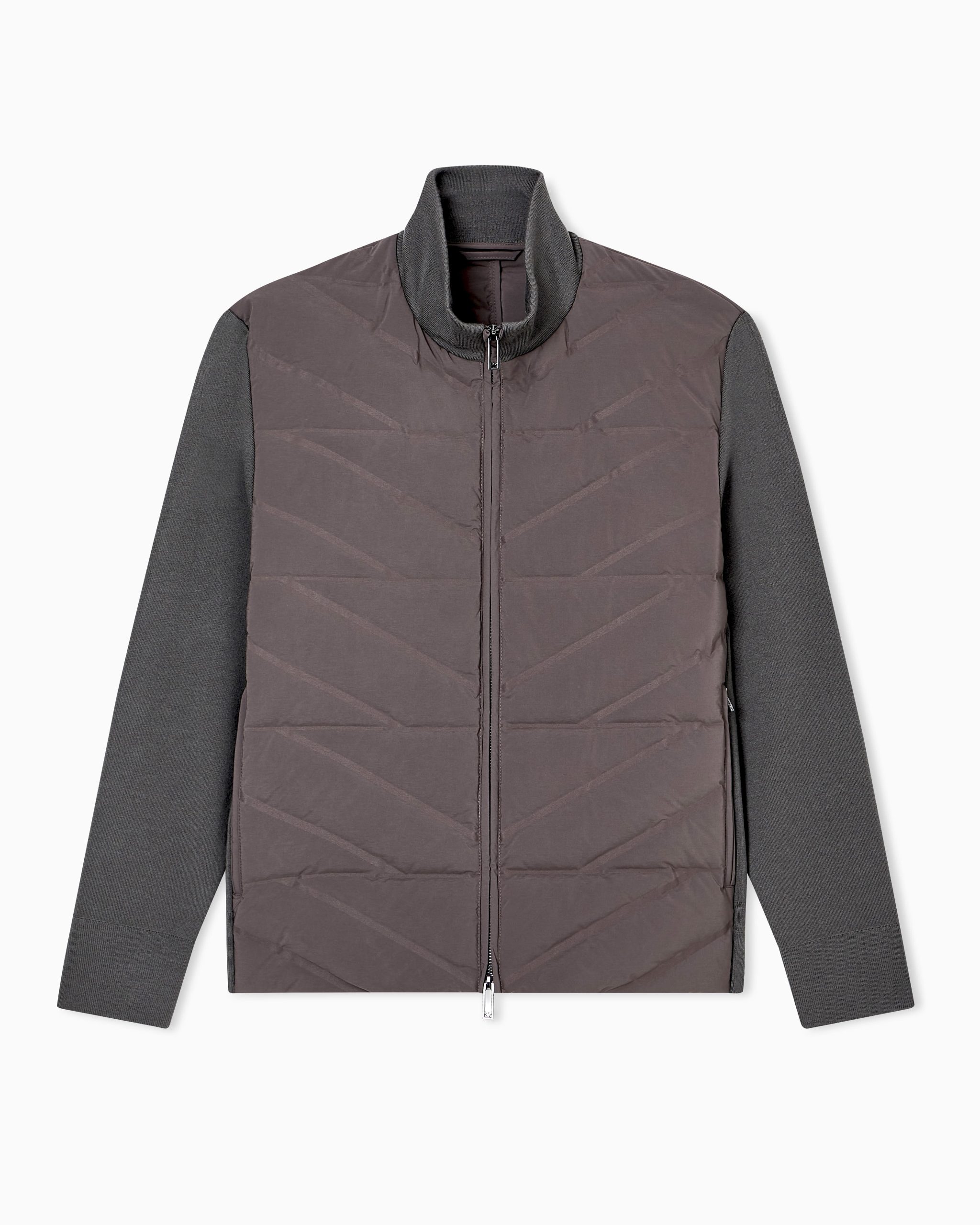 Full-zip down jacket with nylon front and back and genuine down filling. The plain-knit virgin wool collar, sleeves and side details create a texture contrast and an original two-piece effect, revealing a sleeveless layer over a jumper. The handy inner pockets for your passport and mobile phone are designed for the perfect urban traveller. The piece belongs to the Travel Essentials Autumn/Winter 2025 capsule collection.