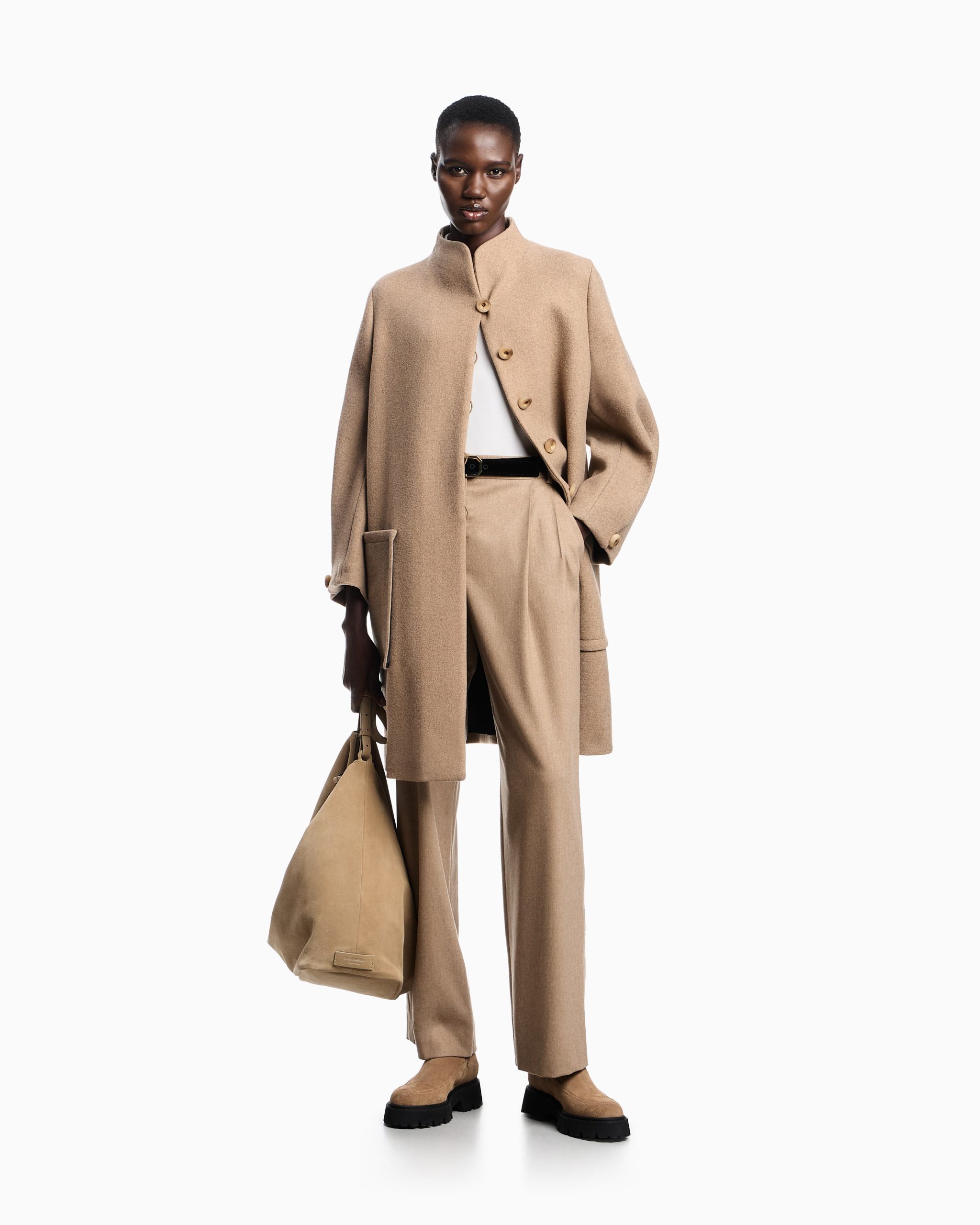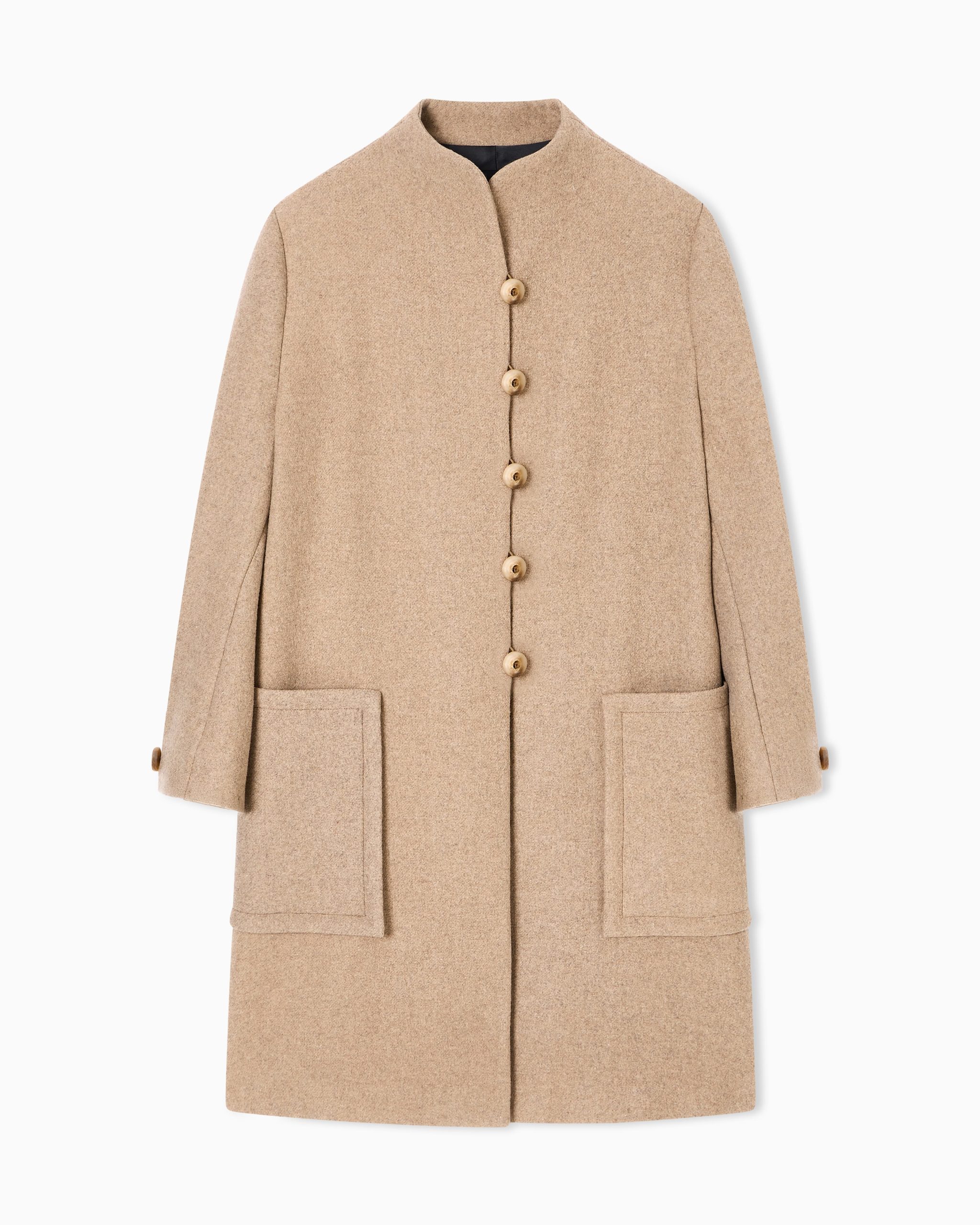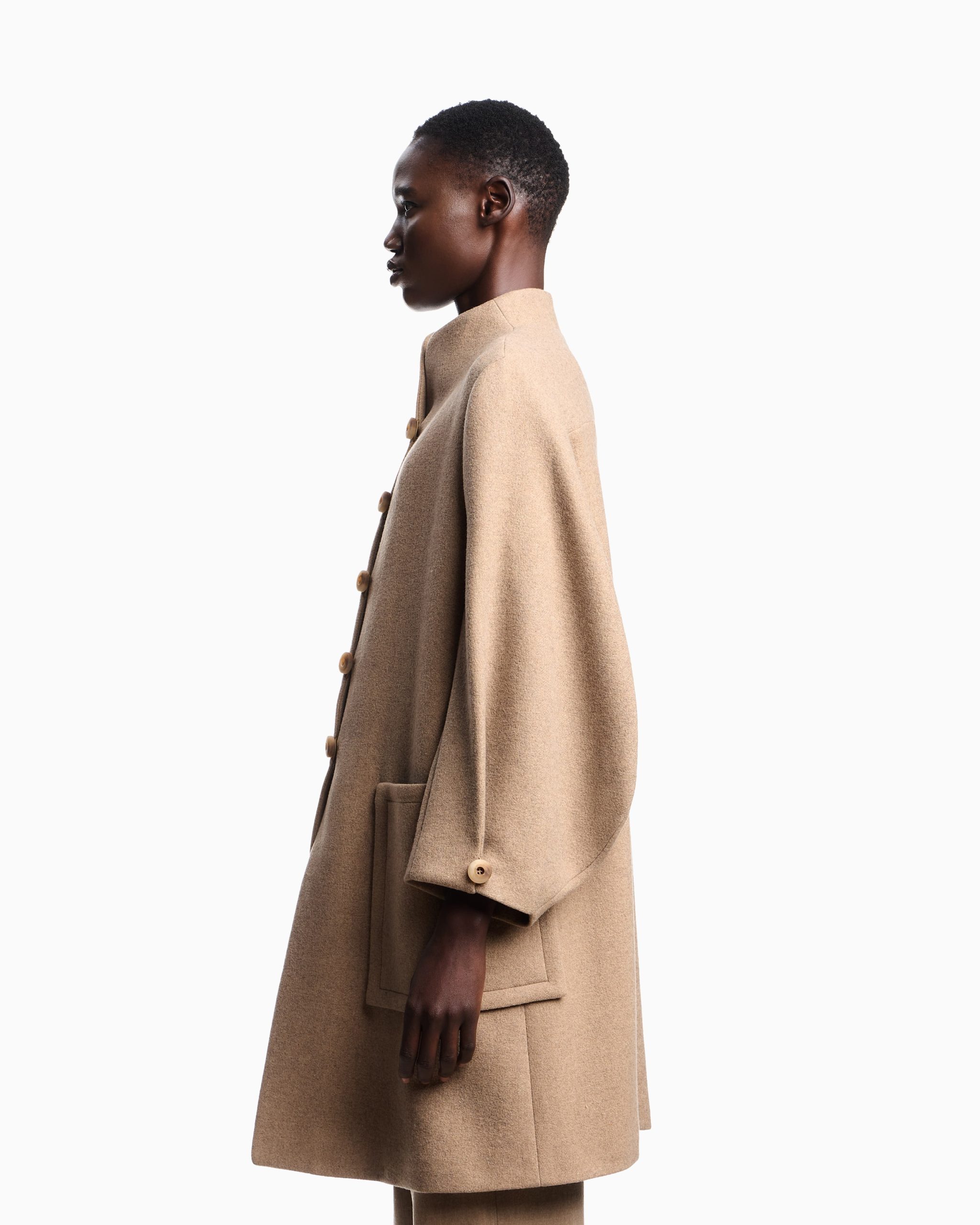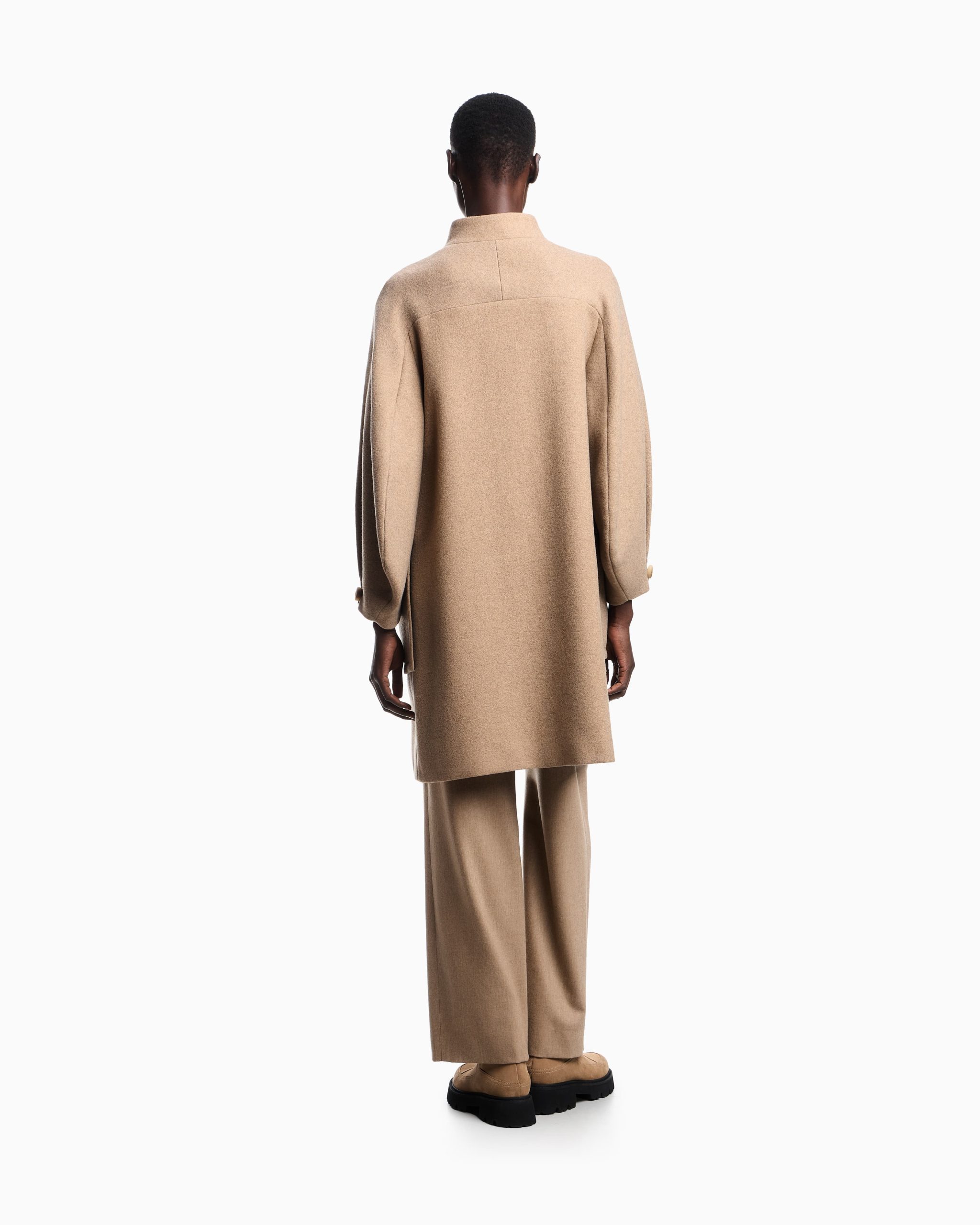 Single-breasted coat with mock neck made of a wool blend. The style features wide oval-shaped sleeves. A modern style that can be worn anywhere, designed for multiple looks, from the most urban to the most formal. The garment is part of the Icon capsule collection.