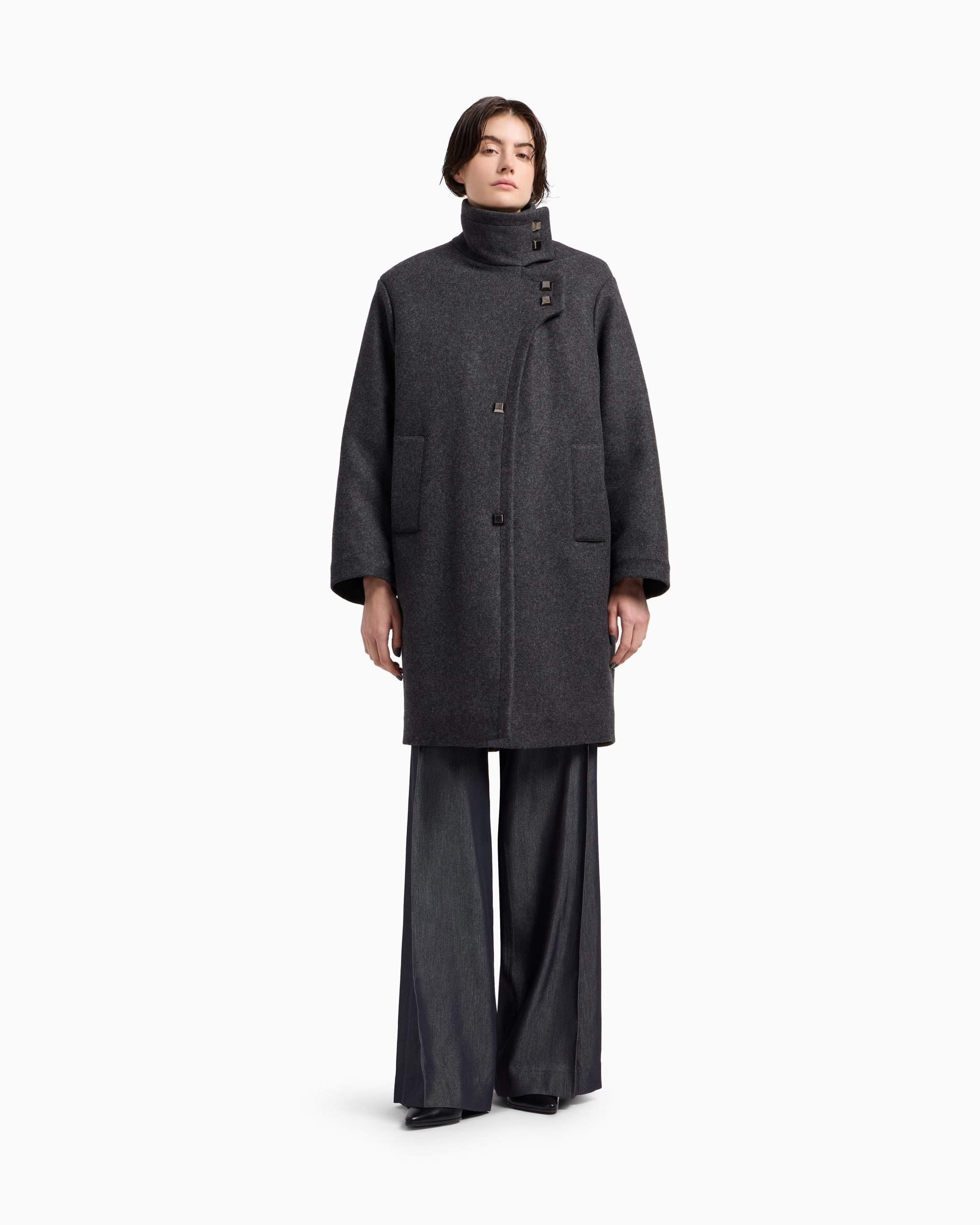 Coat with light internal padding, made of a wool-blend cloth. The modern shape has a mock neck and off-centre closure. The item is part of this season’s new Polygon capsule collection, where vertical lines and geometric cut-outs capture the essence of a modern, elegant design. An offering that exudes post-modernist vibes, creating a perfect balance between functionality and aesthetic harmony: structured and refined creations are developed in mélange grey tones that go hand in hand with the warmest undertones of burgundy.