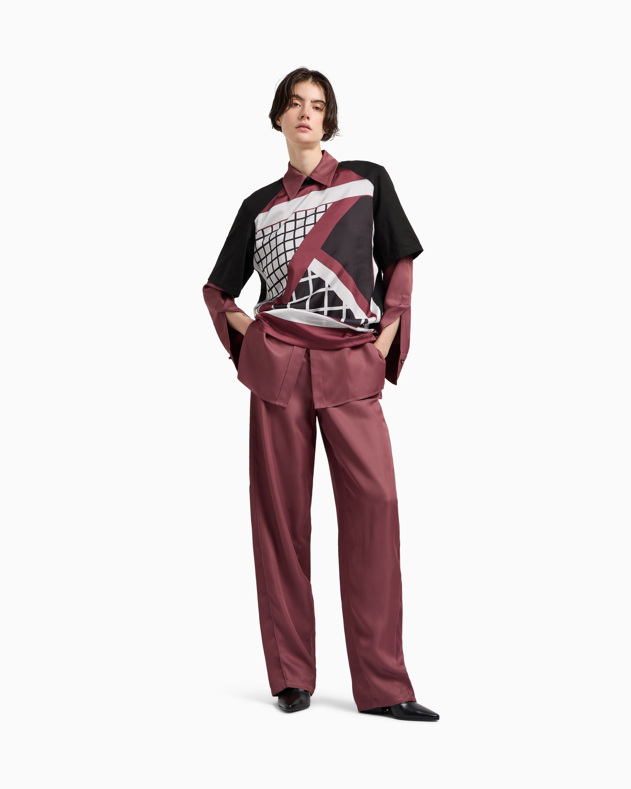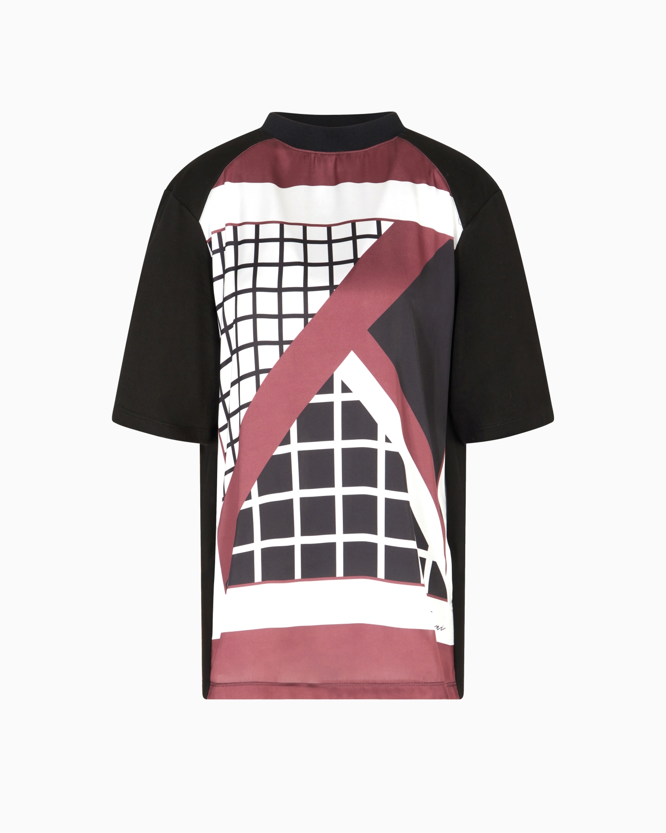 Oversized-fit, crew-neck T-shirt made of heavyweight jersey. The style is embellished with a collection-print satin insert that characterises the front of the garment. The item is part of this season’s new Polygon capsule collection, where vertical lines and geometric cut-outs capture the essence of a modern, elegant design. An offering that exudes post-modernist vibes, creating a perfect balance between functionality and aesthetic harmony: structured and refined creations are developed in mélange grey tones that go hand in hand with the warmest undertones of burgundy.