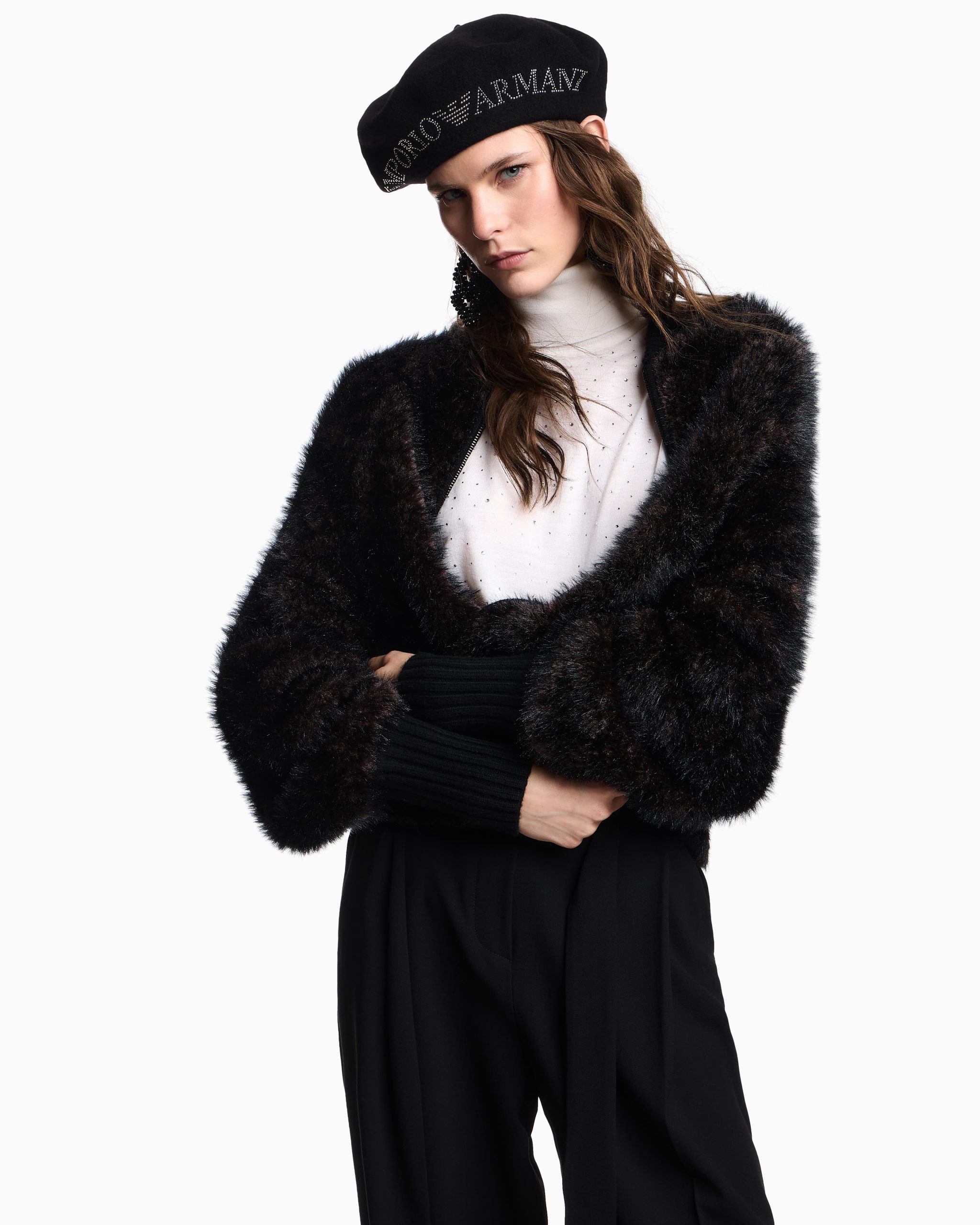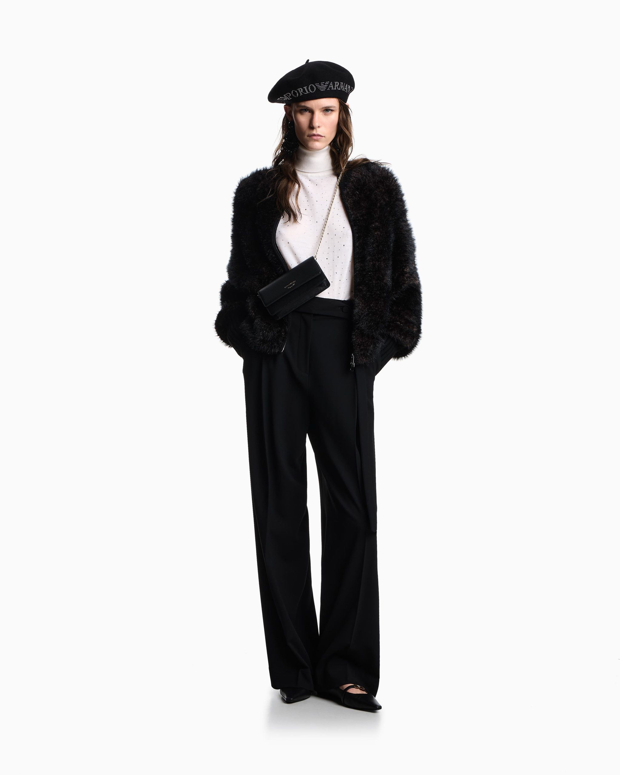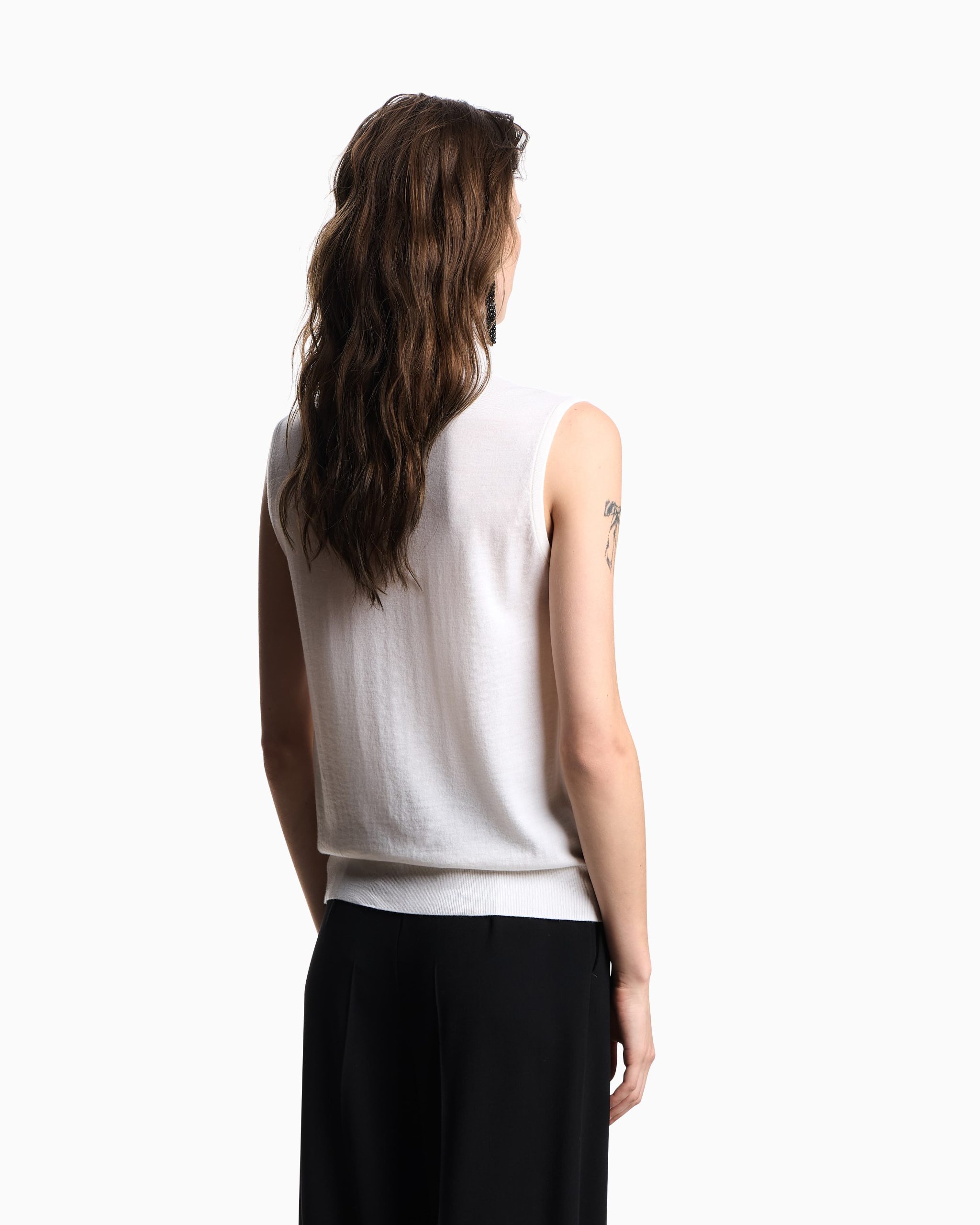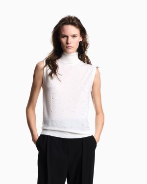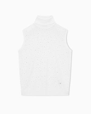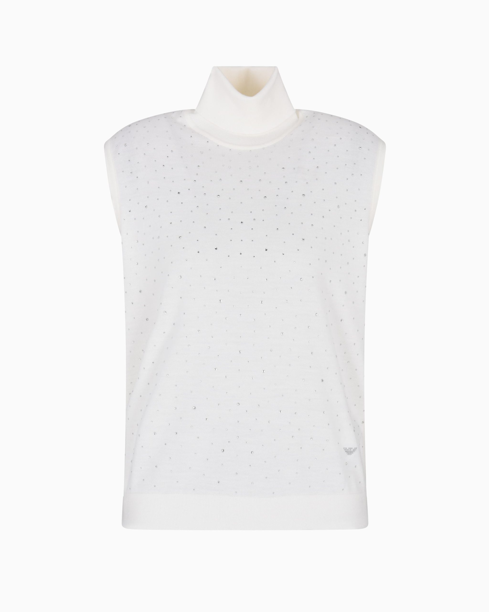 Sleeveless, rollneck jumper made from virgin wool in a plain knit. The item’s front is embellished with micro rhinestones that create a myriad of highlights.