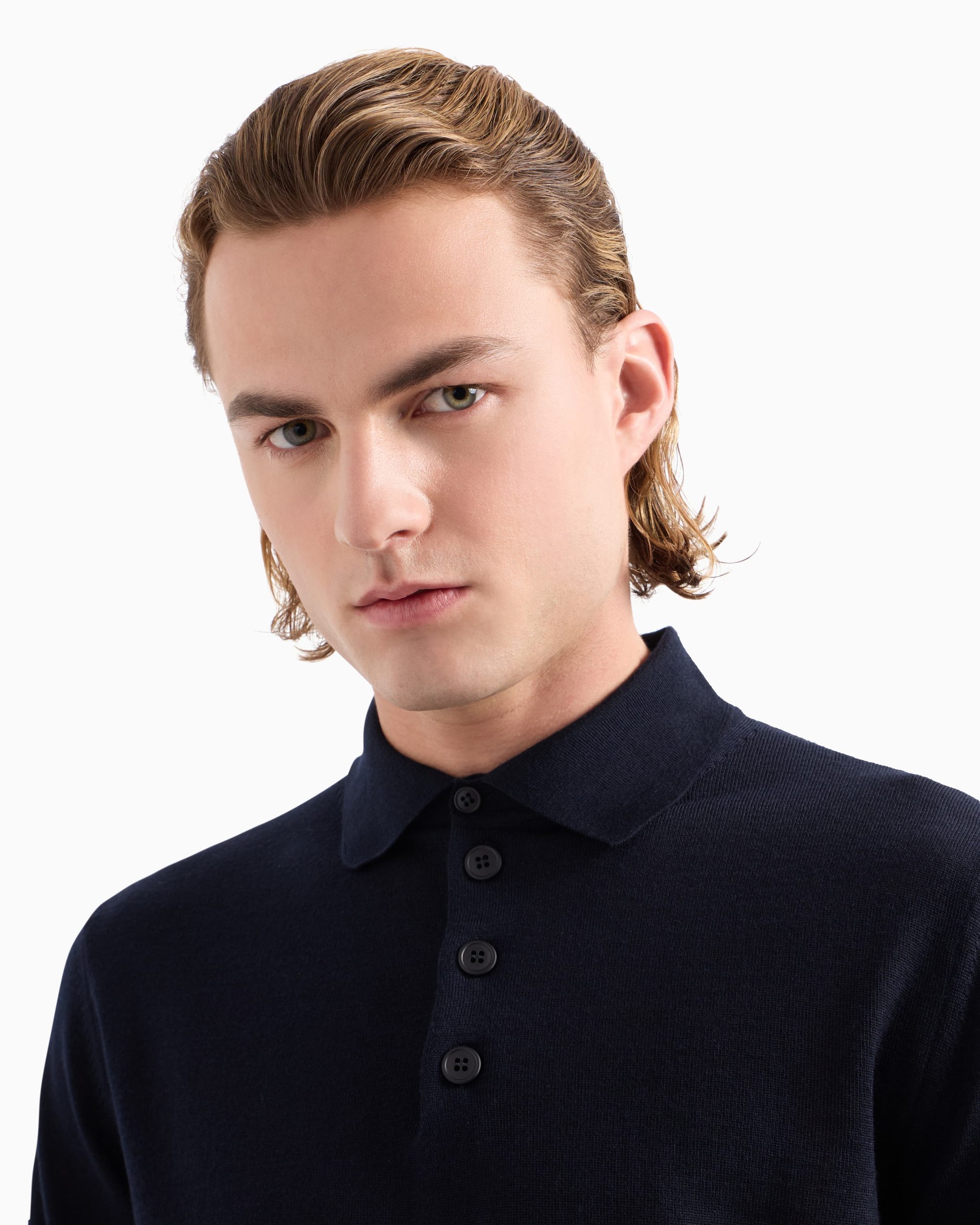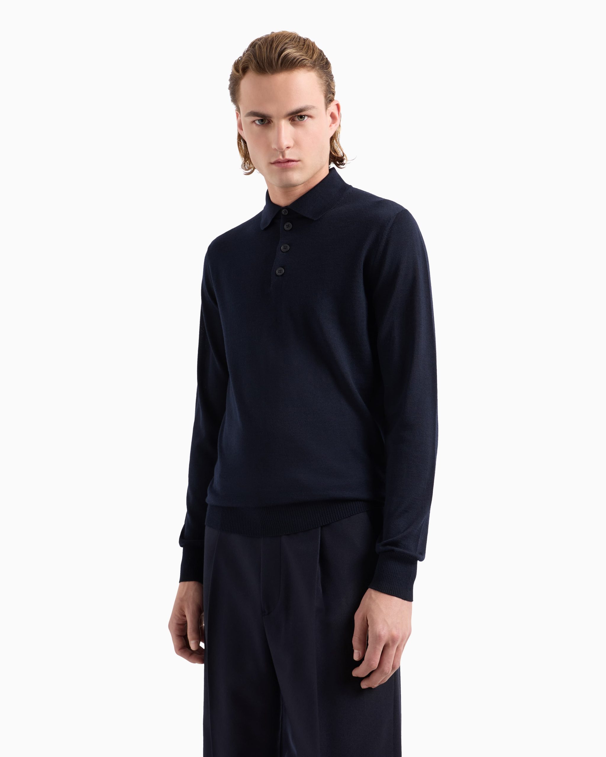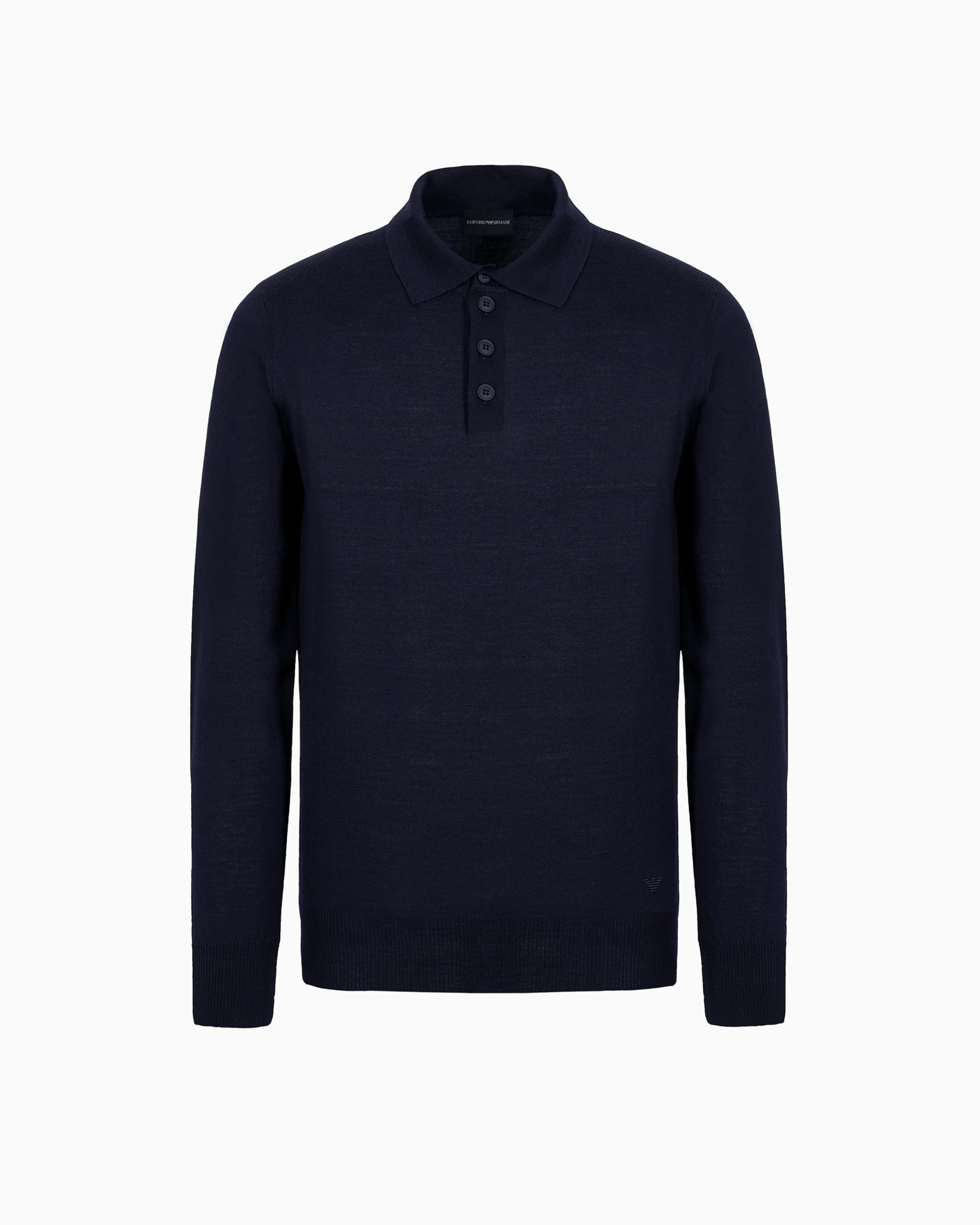 Pure virgin wool jumper with polo-shirt style collar. As practical as a jumper and as casual as a polo shirt: two wardrobe staples are combined to create this plain-knit, virgin-wool jumper. Ribbed trim and an embroidered iconic eagle at the hem complete the style. This item belongs to the Essentials clothing selection, the Emporio Armani capsule collection that is an evergreen statement of style: an ongoing collection with clean, well-designed shapes for a wardrobe that meets the demands of any season. These “essential”, versatile pieces are a must-have for the male wardrobe.