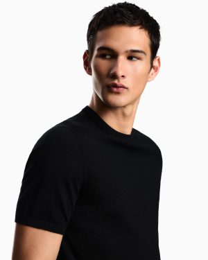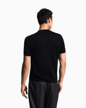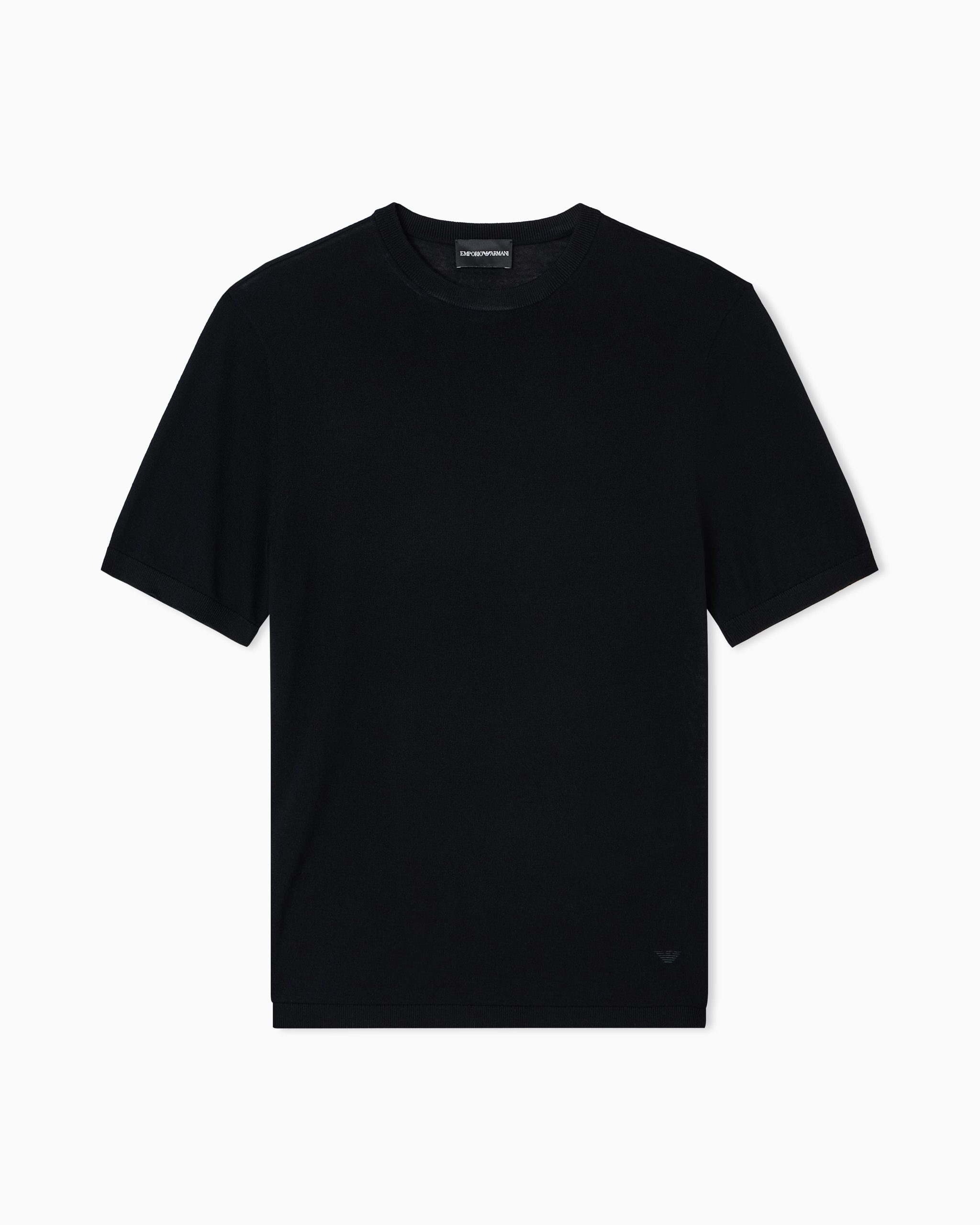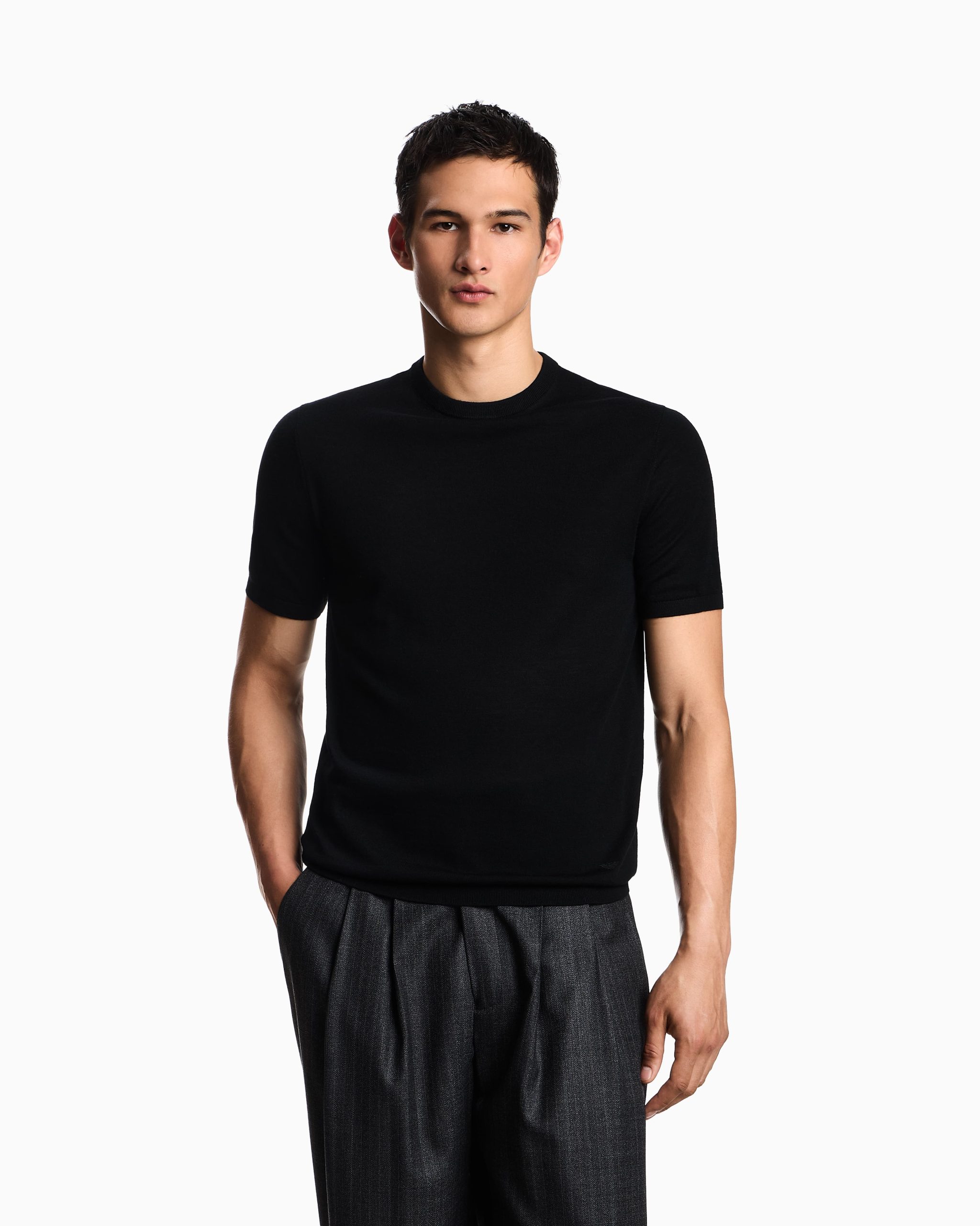 Short-sleeved crew-neck jumper made in a seamless, plain-knit pure virgin wool. The matching embroidery with micro eagles on the left hem adds a distinctive touch.