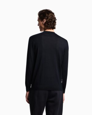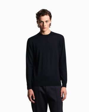 Plain-knit, pure virgin wool, crew-neck jumper. The piece belongs to the Travel Essentials Autumn/Winter 2025 capsule collection.