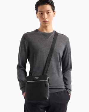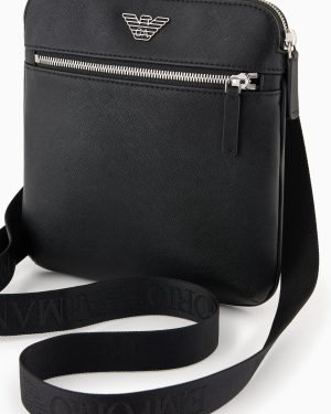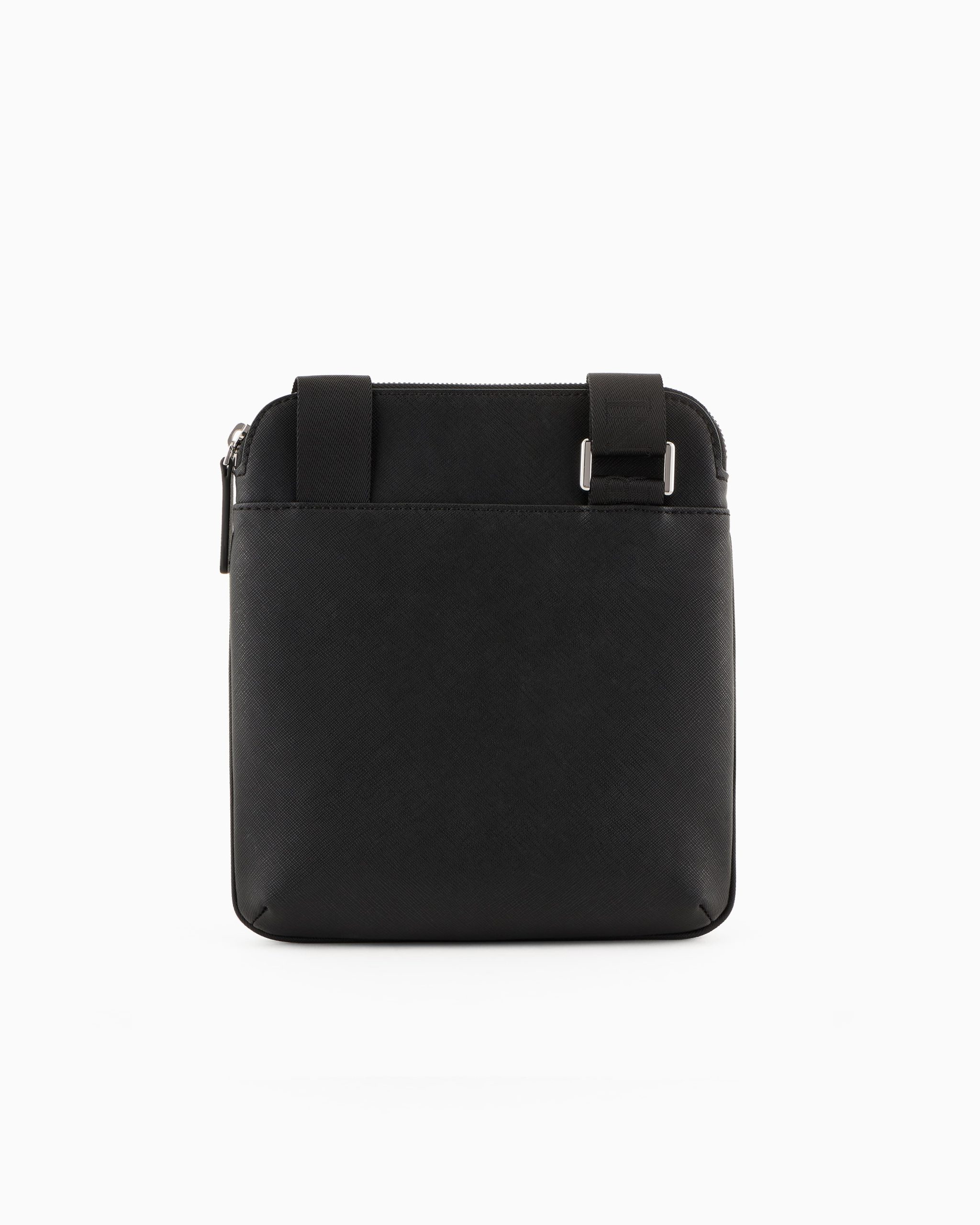 Flat, regenerated-leather shoulder bag made from certified recycled material, perfect for daily living. Zipped closure and outer pocket. Every product made from regenerated leather is the result of an eco-sustainable process that re-purposes left-over leather, processed and assembled without using any adhesive whatsoever and very conscious of water conservation.Not wasting resources helps to make this leather an environmentally friendly material, yet it retains the same qualities of real leather, both to the eye and to the touch. A collection of accessories created to satisfy the requirements of the Emporio Armani man who demands stylish, work-ready looks. The essential, alluring design features a Saffiano-print finish and is customised with a shaped, perforated metal eagle logo.