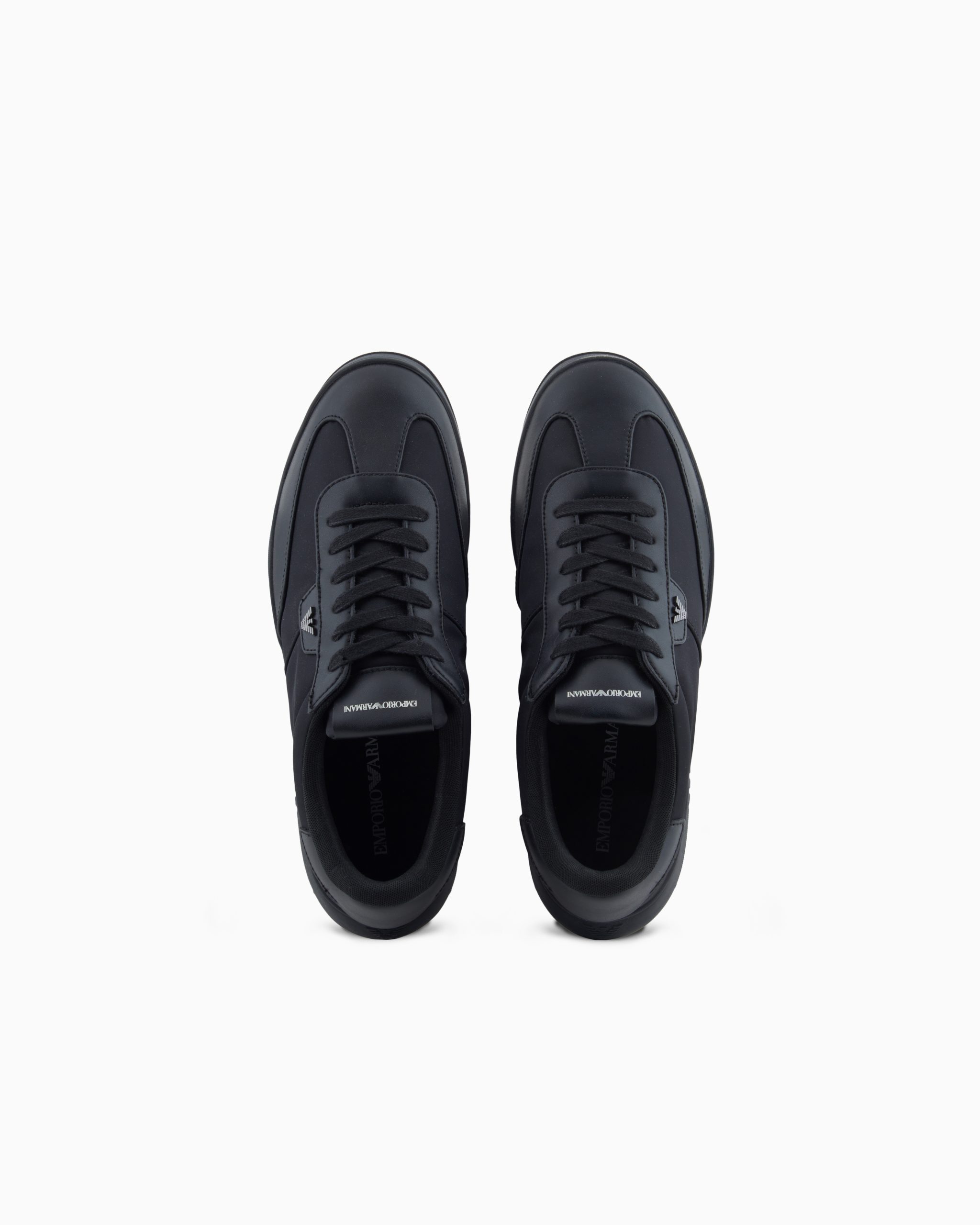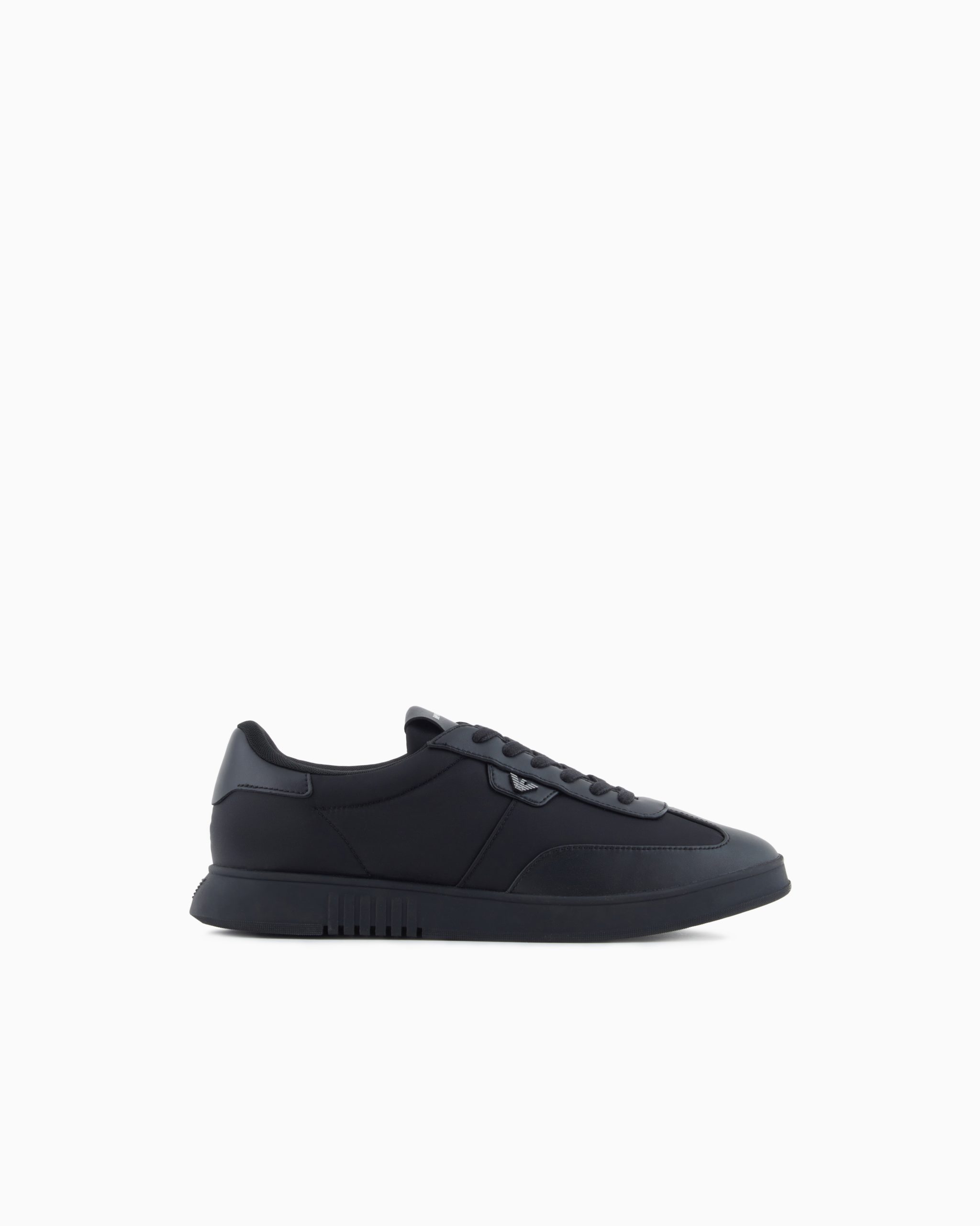 Nylon sneakers with leather details. The minimalist style is distinguished by an elegant and modern silhouette with an iconic metal contoured eagle on the outer side. Versatile sneakers suitable for multiple occasions.