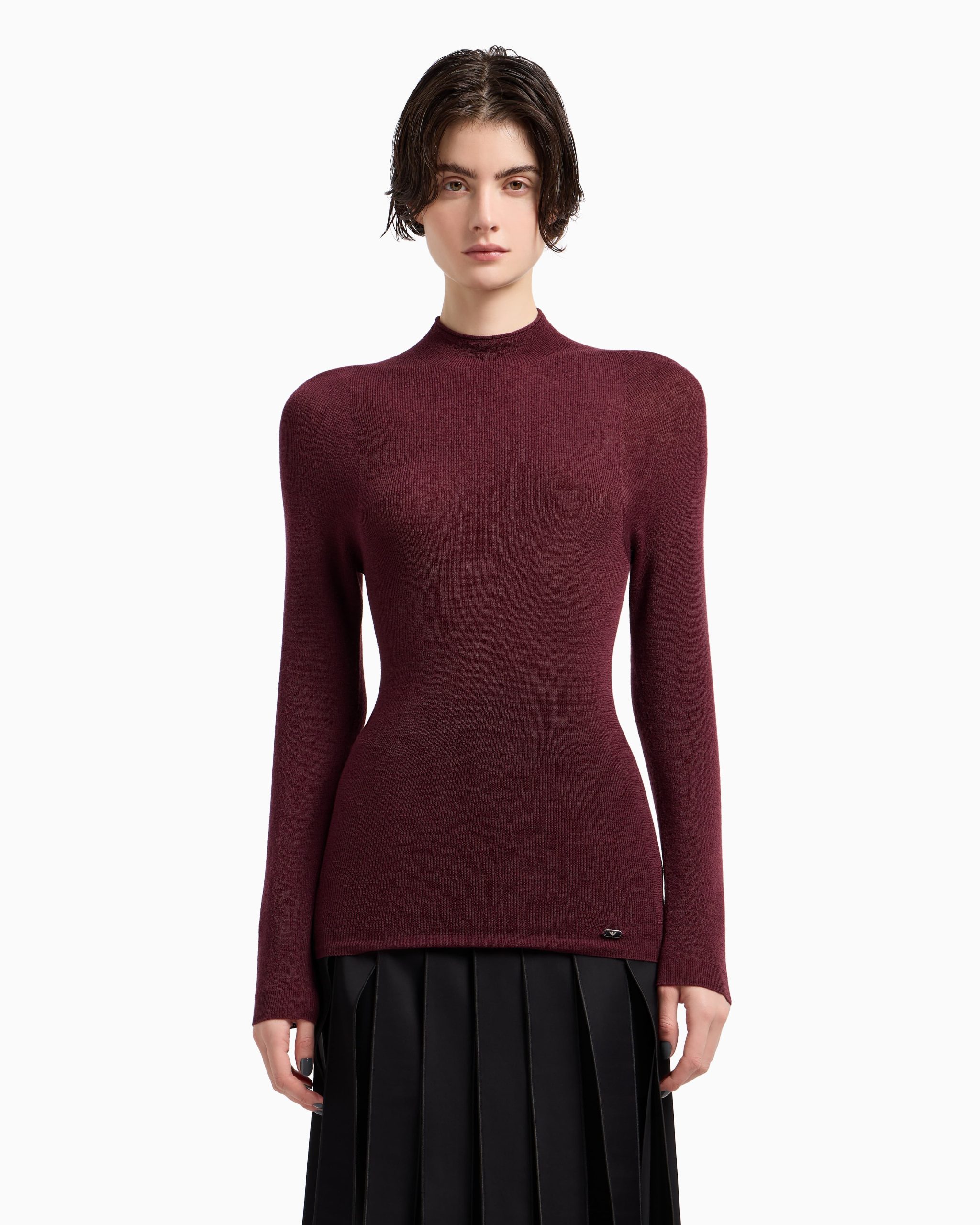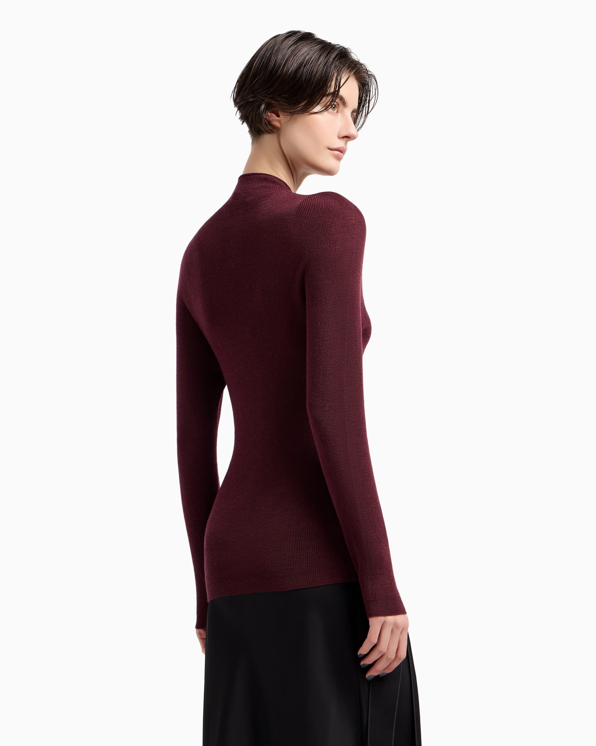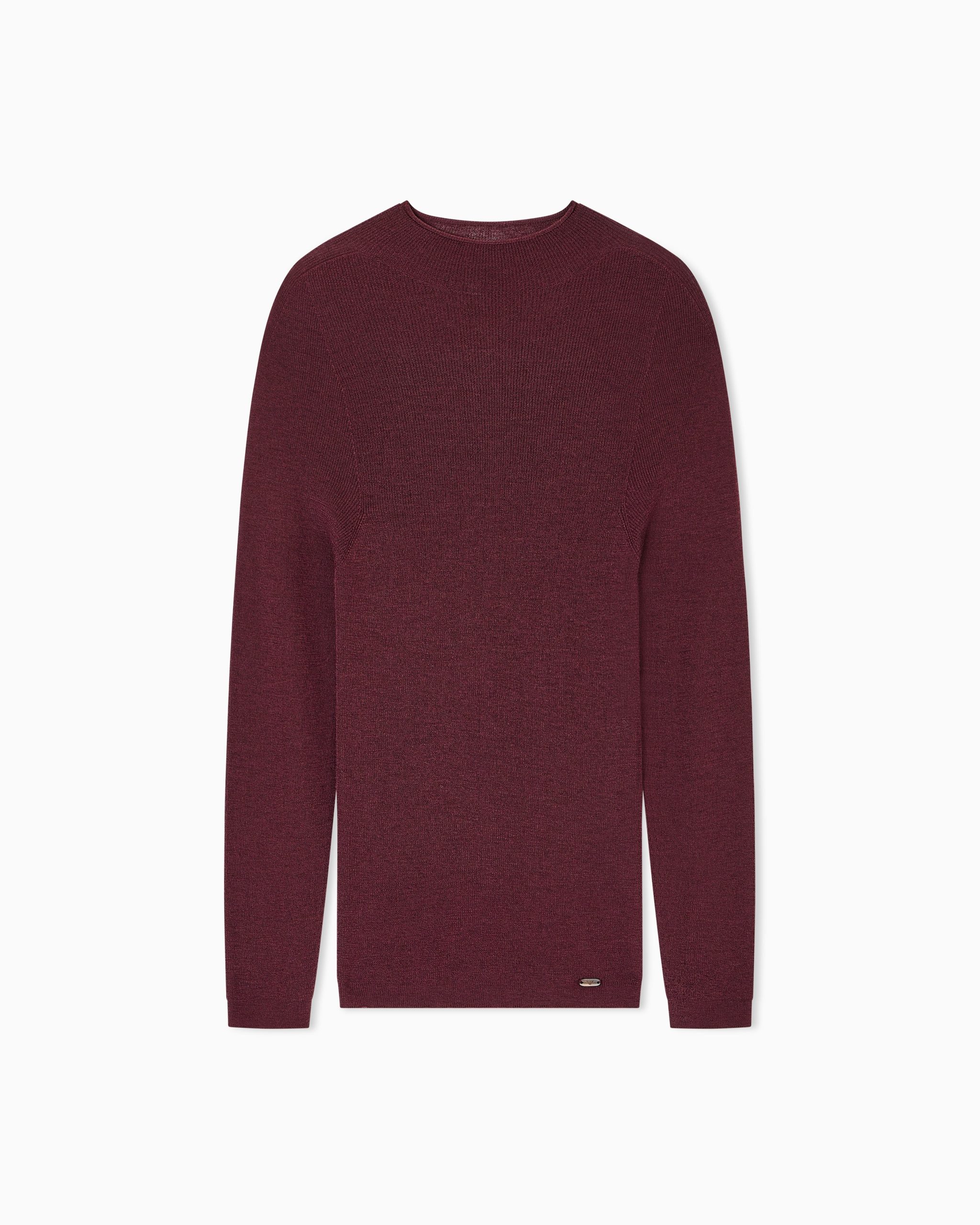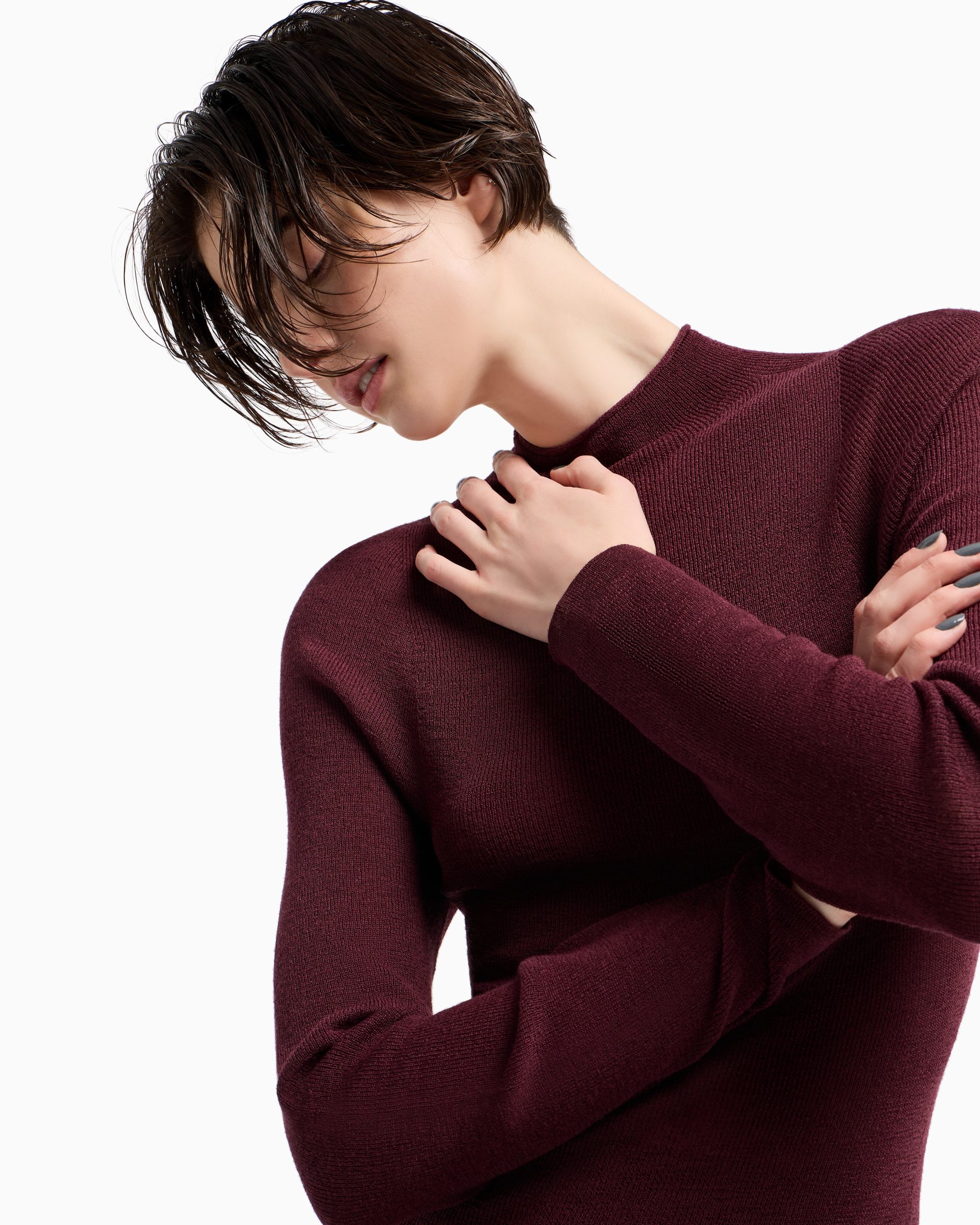 Long-sleeved mock-neck jumper made from a virgin wool blend with a brushed knit. The style is part of this season’s new Polygon capsule collection, where vertical lines and geometric cut-outs capture the essence of a modern, elegant design. An offering that exudes post-modernist vibes, creating a perfect balance between functionality and aesthetic harmony: structured and refined creations are developed in mélange grey tones that go hand in hand with the warmest undertones of burgundy.