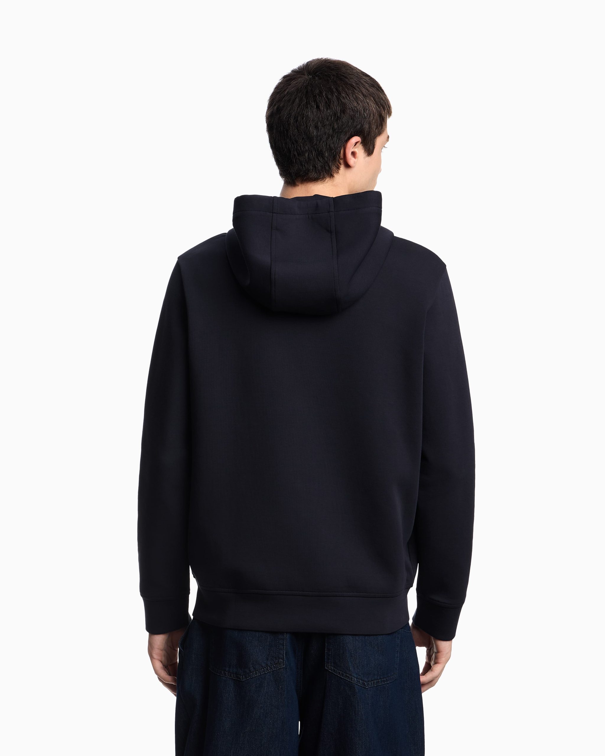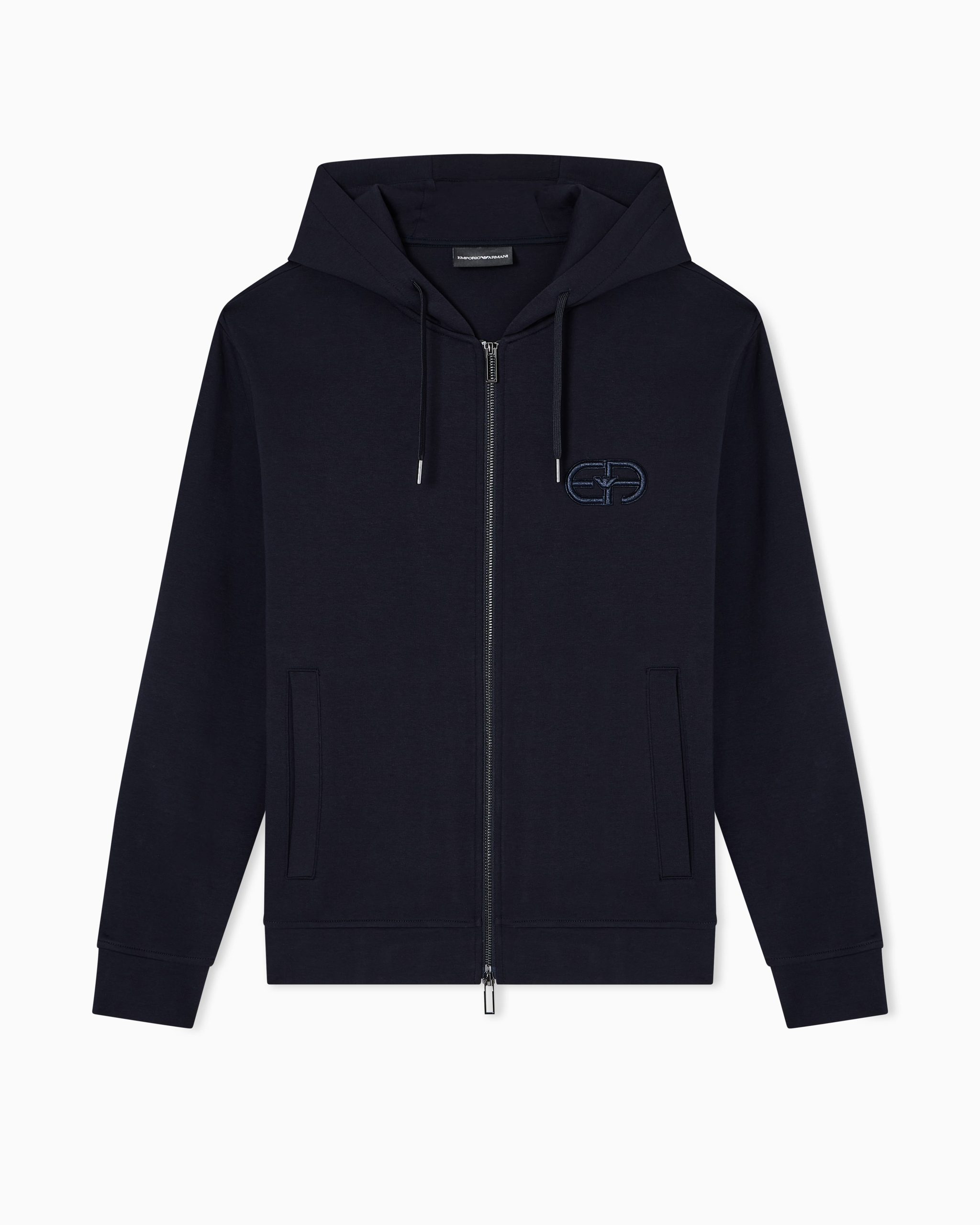 Double-jersey, hooded sweatshirt with zip closure. The piece features a fresh, easy allure, accentuated by the matching embossed, embroidered logo on the chest. This item belongs to the Essentials clothing selection, the Emporio Armani capsule collection that is an evergreen statement of style: an ongoing collection with clean, well-designed shapes for a wardrobe that meets the demands of any season. These “essential”, versatile pieces are a must-have for the male wardrobe.