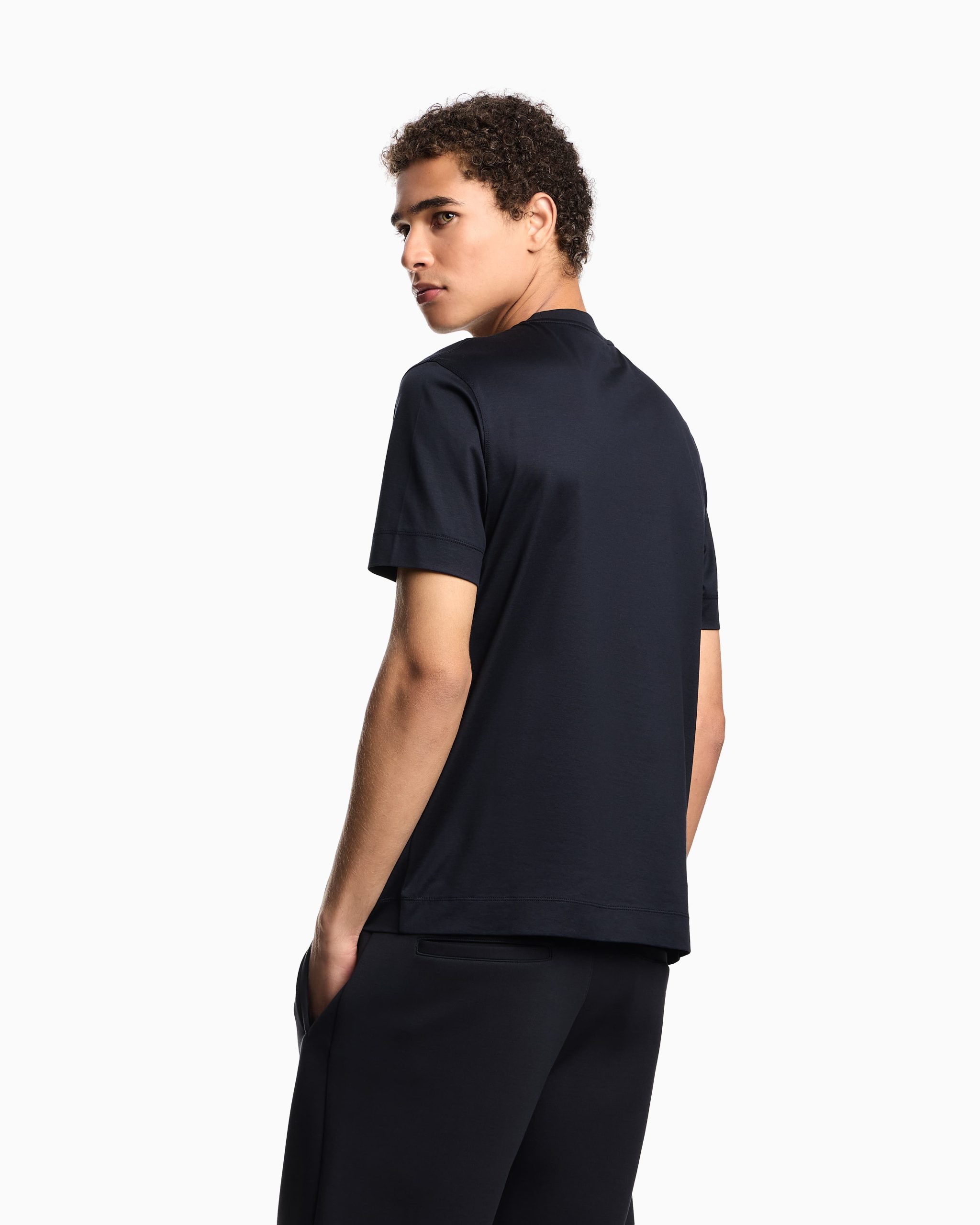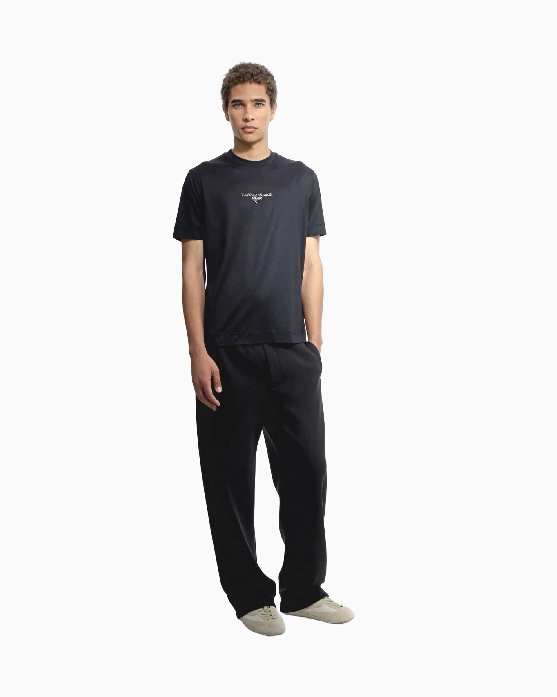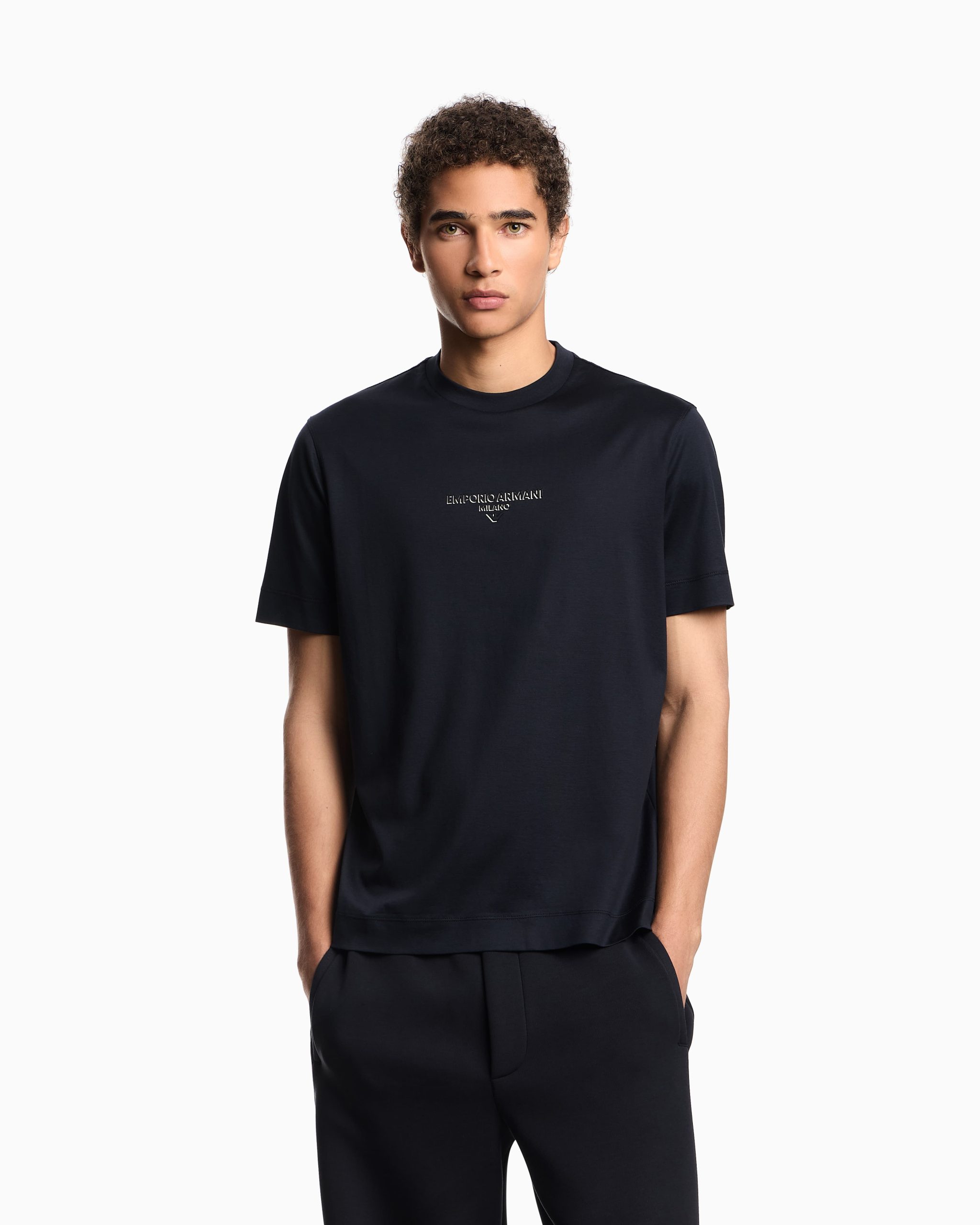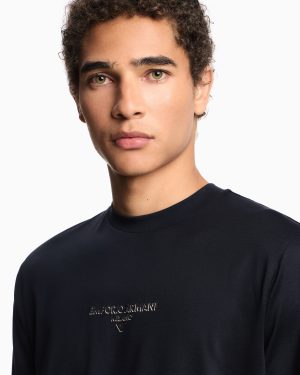 Cotton and Lyocell blend jersey crew-neck T-shirt. The Emporio Armani Milano logo accompanied by the iconic eagle is offered with an original three-dimensional effect: the matching dark part is created using an embossed technique that gives the subject an embossed domed look, while the contrasting white print creates a chiaroscuro shaded effect that enhances the 3D look.