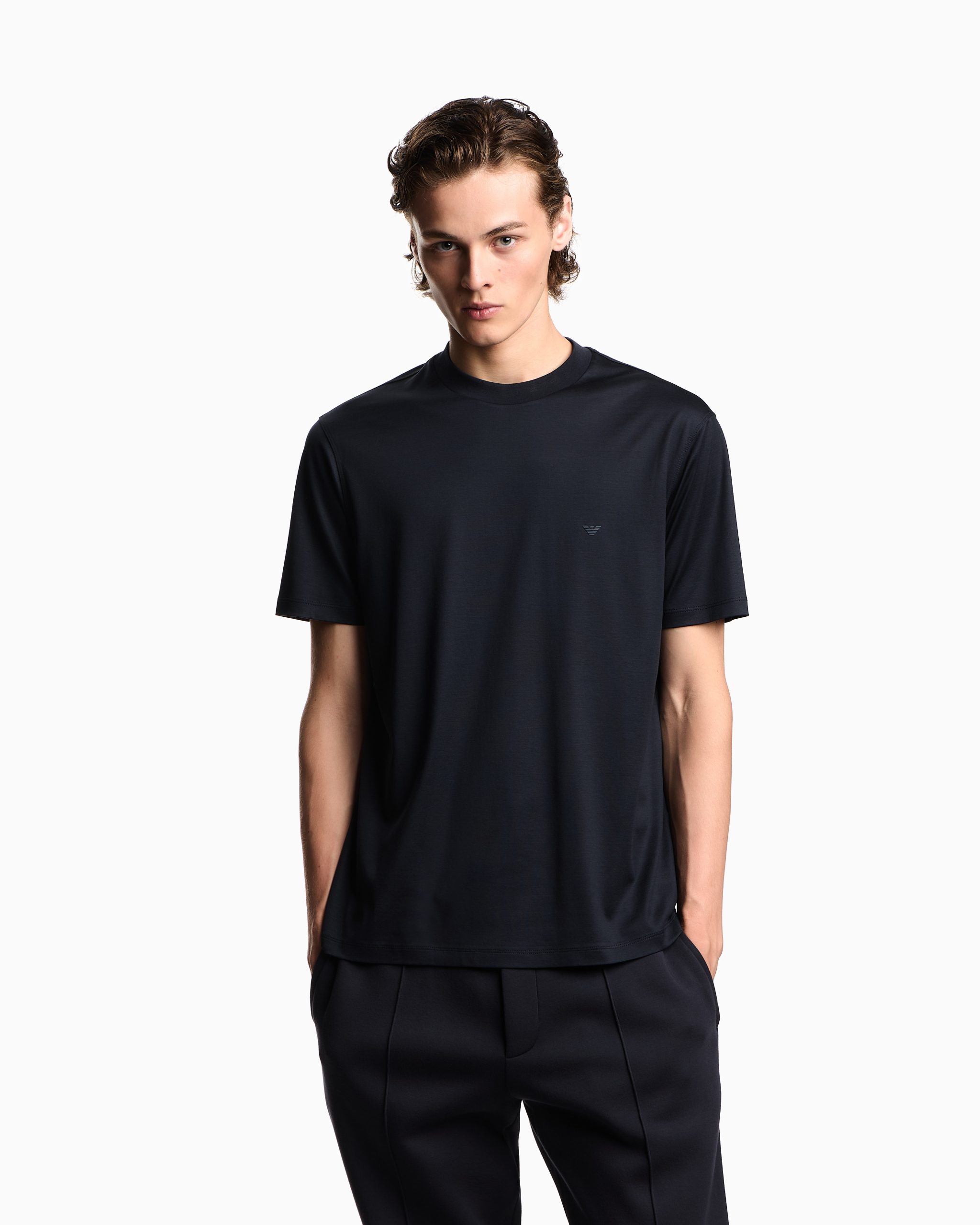 Cotton and Lyocell blend jersey crew-neck T-shirt. The matching, micro eagle embroidery on the chest completes the style with distinction. The piece belongs to the Travel Essentials Autumn/Winter 2025 capsule collection.