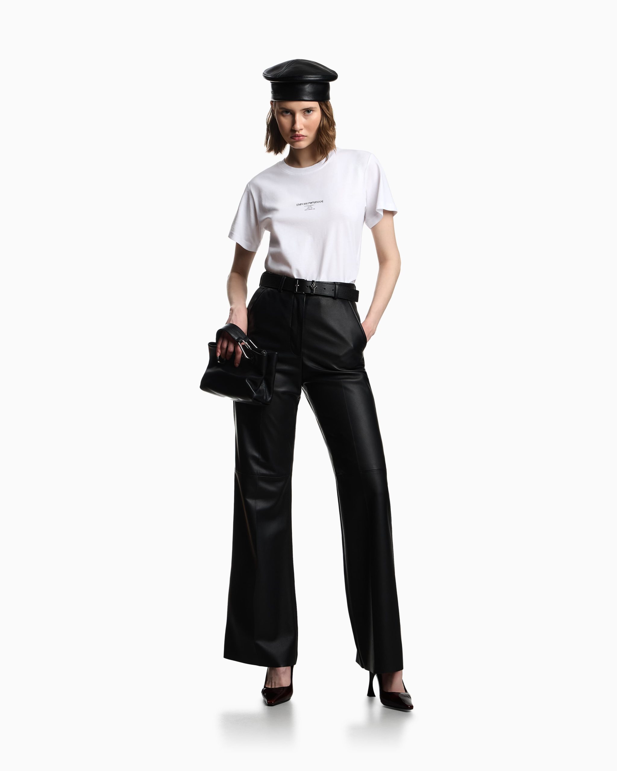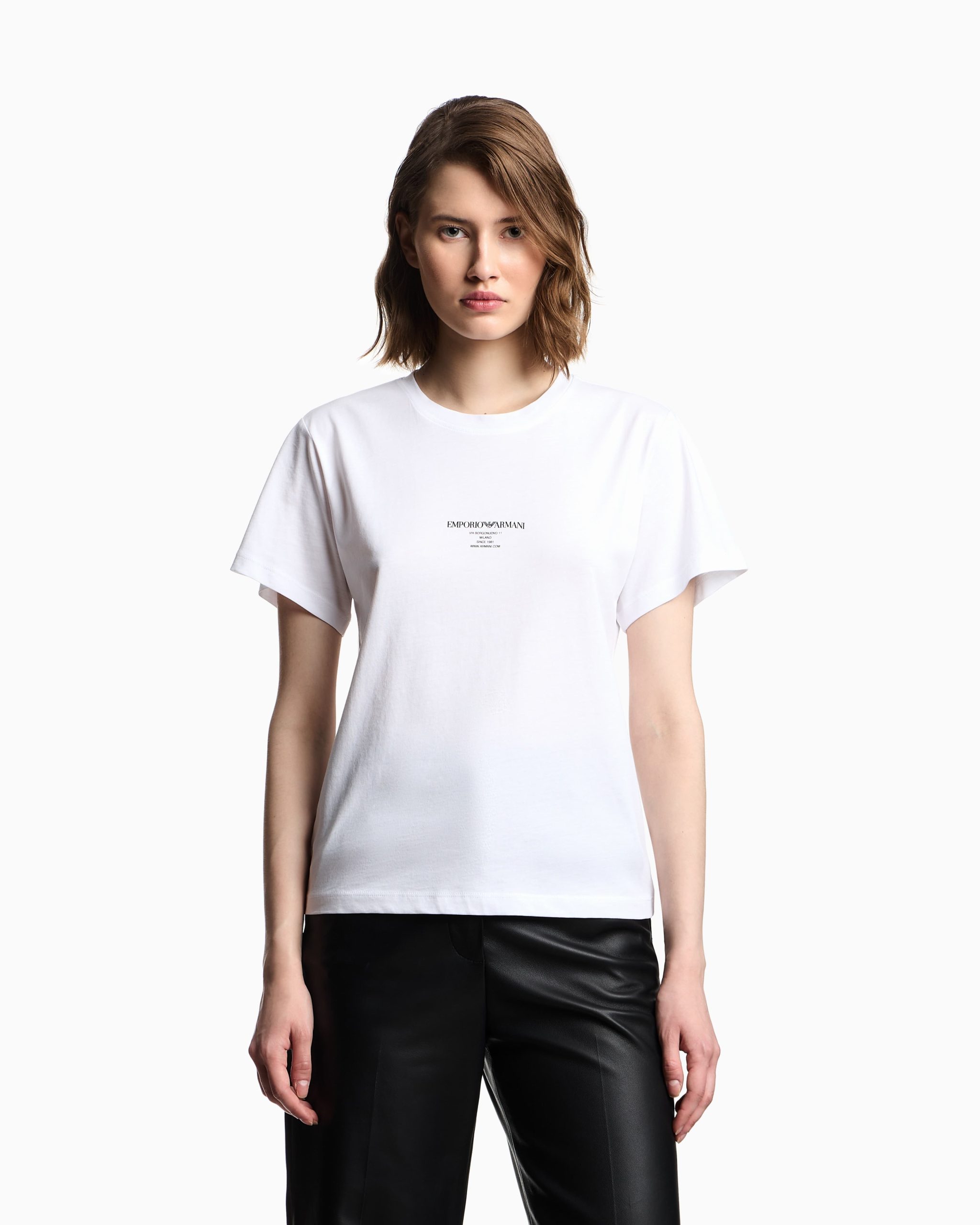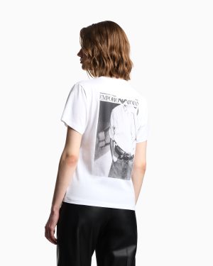 Crew-neck T-shirt in cosy cotton jersey. The style is embellished with a contrasting Emporio Armani logo on the chest and an oversized photographic print on the back.