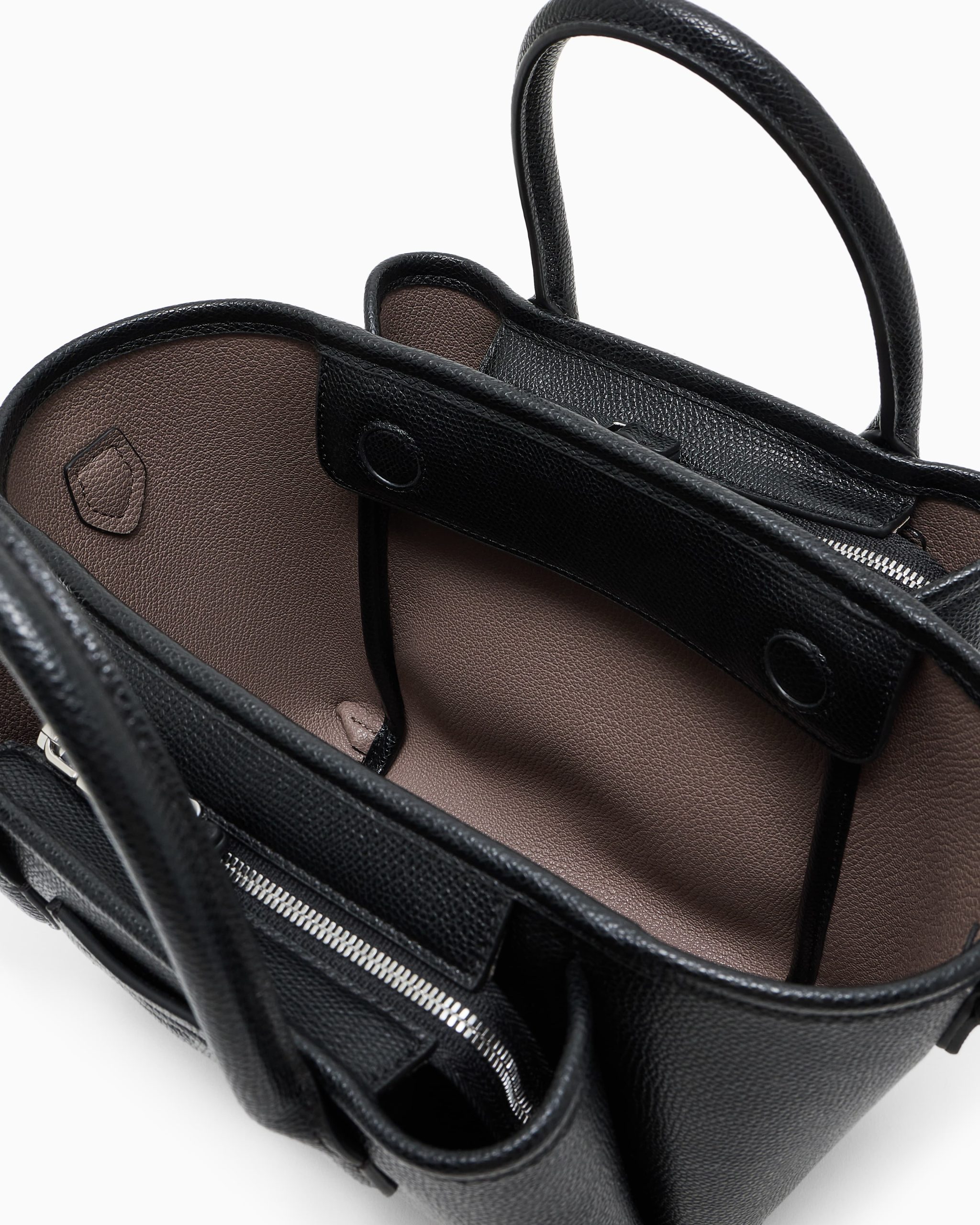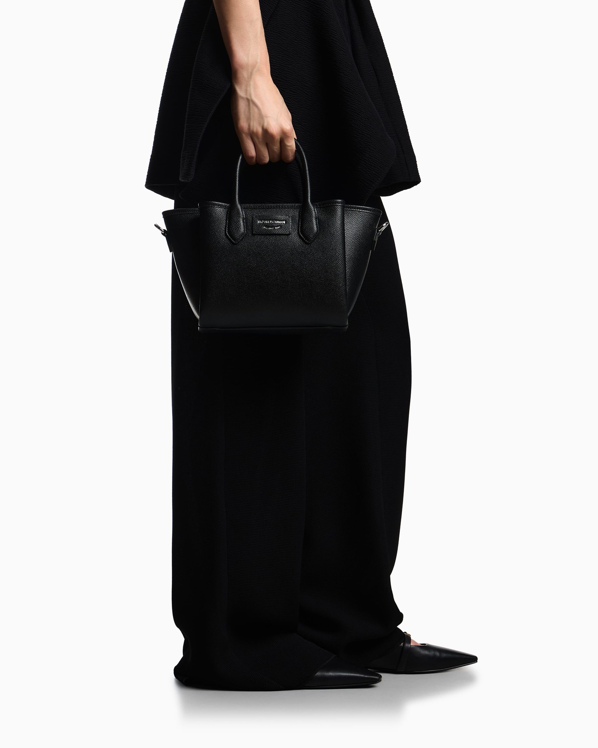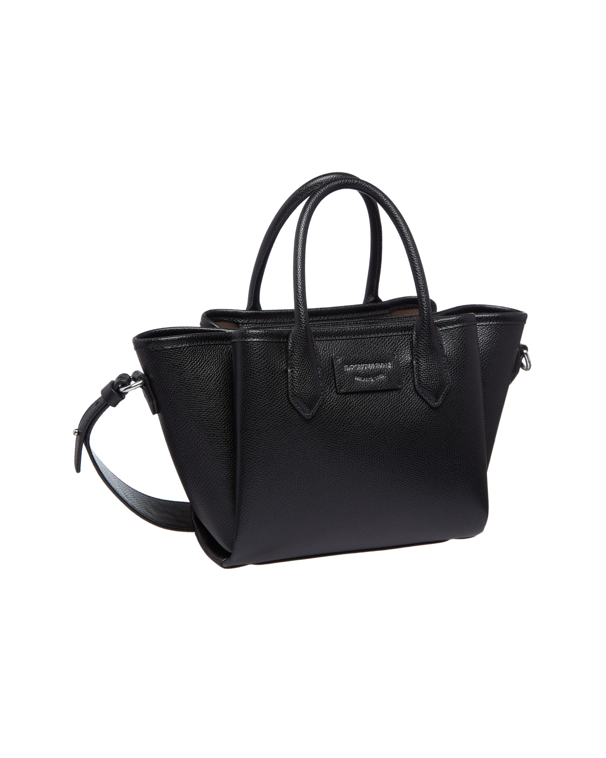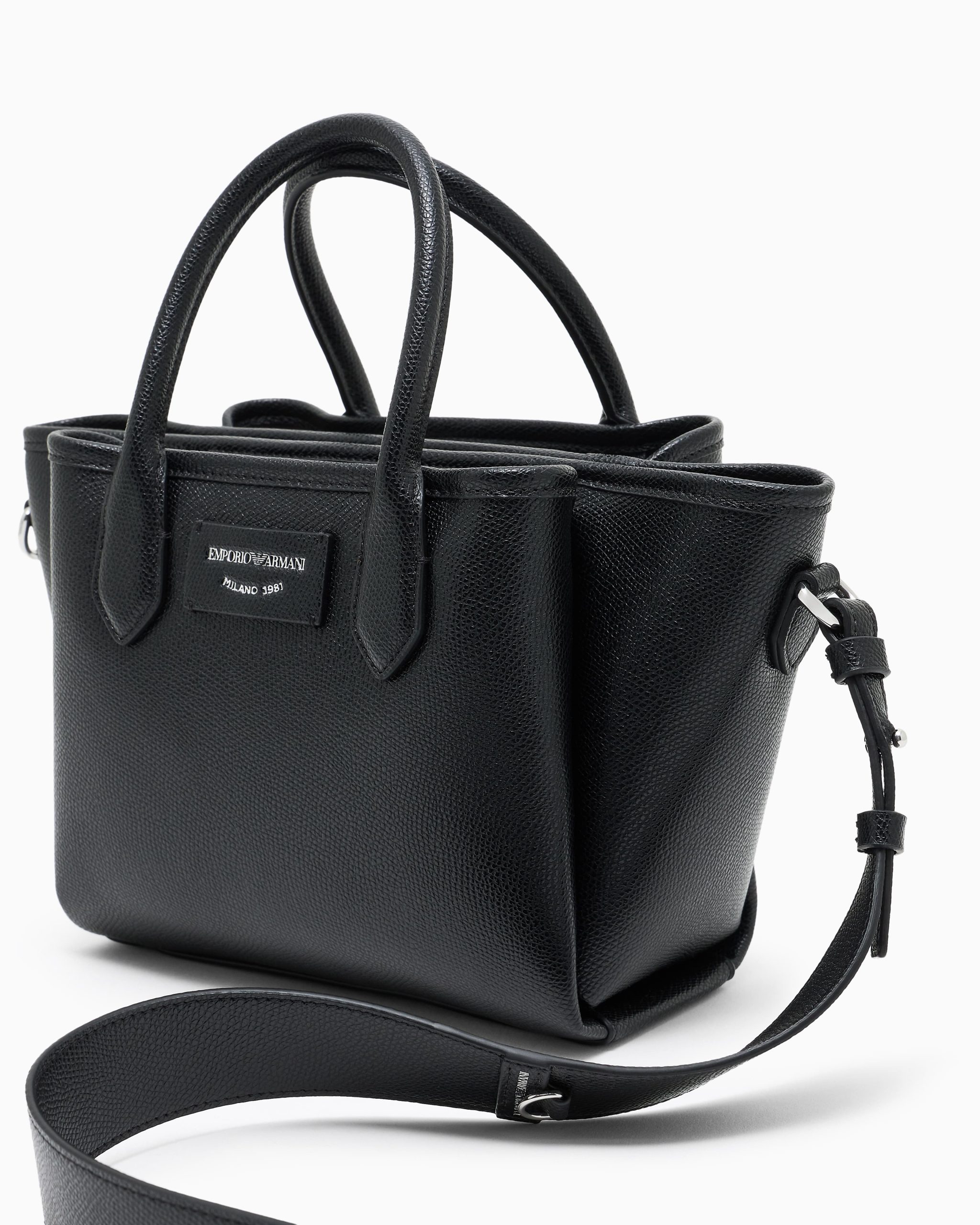 Small shopper bag with double handle and practical detachable shoulder strap. Essential and simple design for a line of accessories that combines style and functionality, perfect for any occasion, from travelling to wearing every day. The screen-printed logo blends with the palmellato-leather finish featured on this selection.