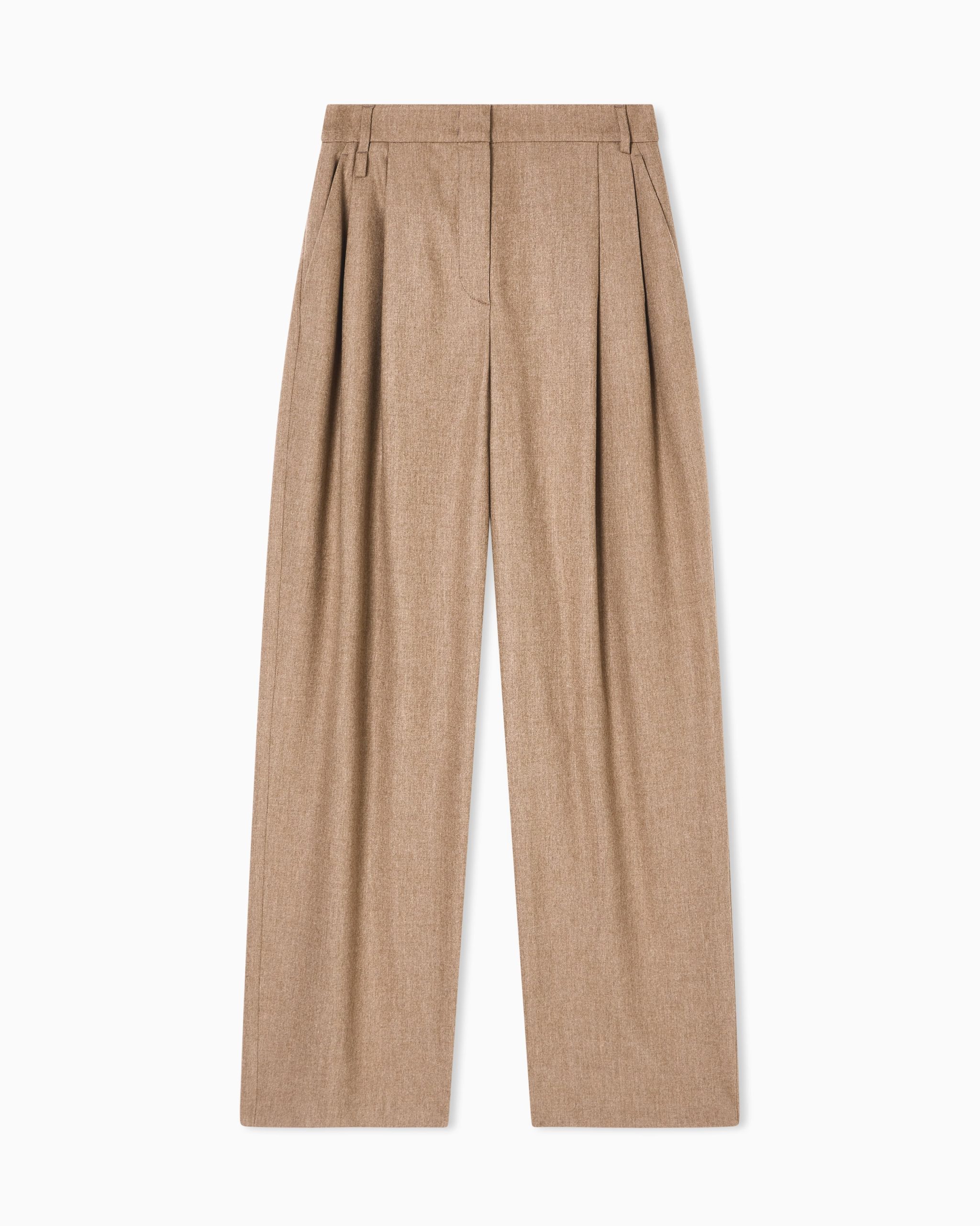 Trousers with pleats made of a virgin-wool flannel with a small percentage of cashmere that enhances its smooth feel. The pleats create a sophisticated vertical crease along the wide leg. The garment is part of the Icon capsule collection.