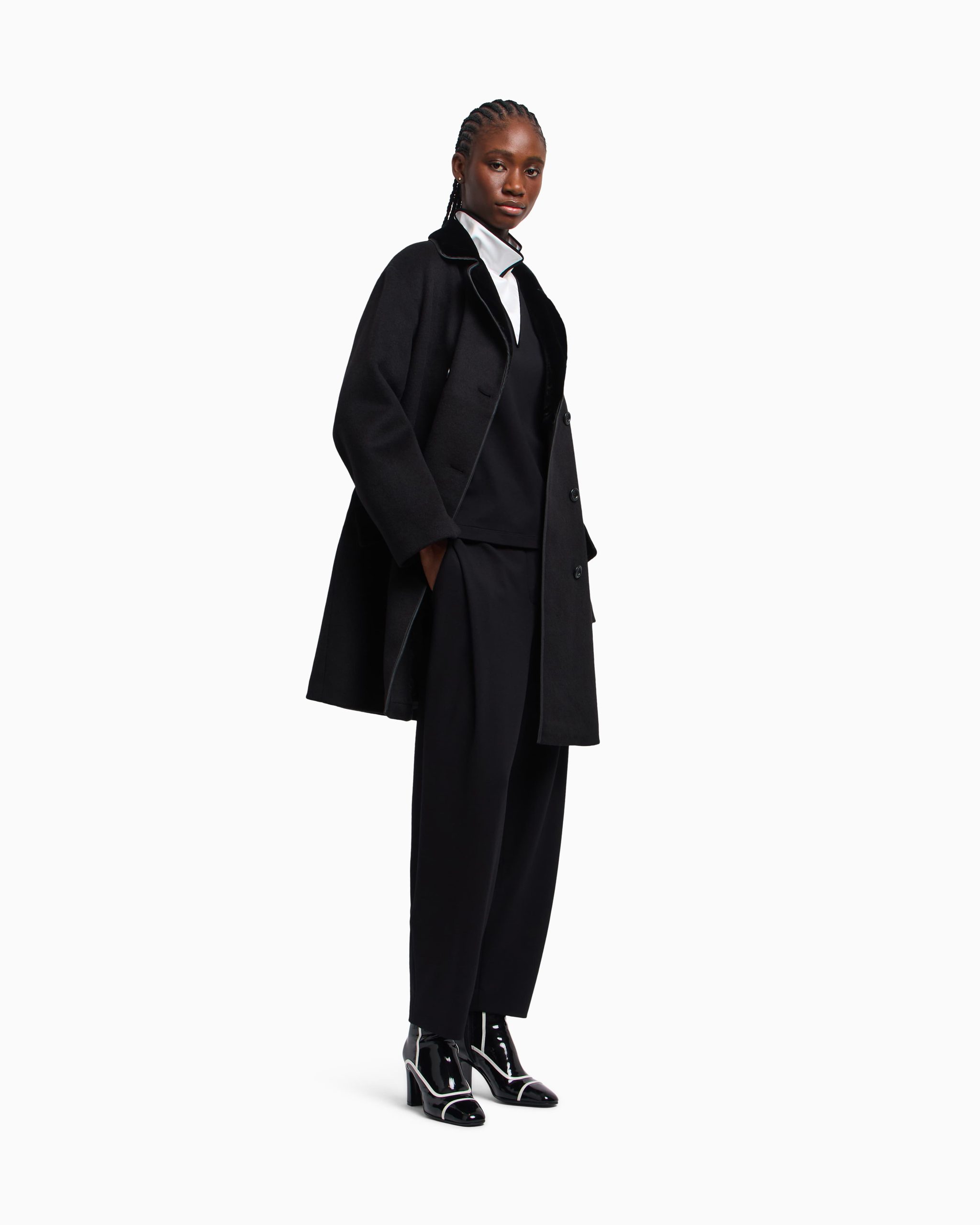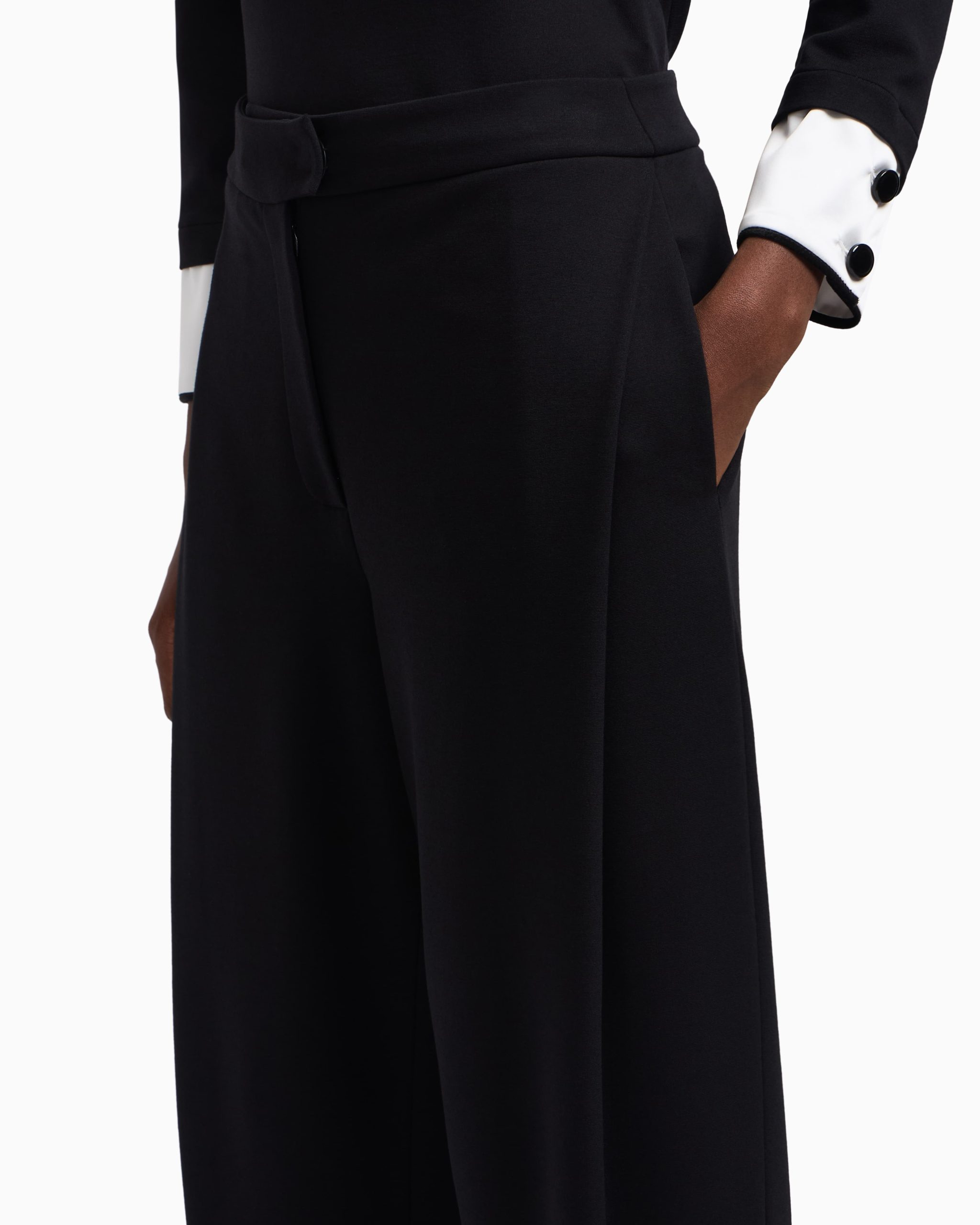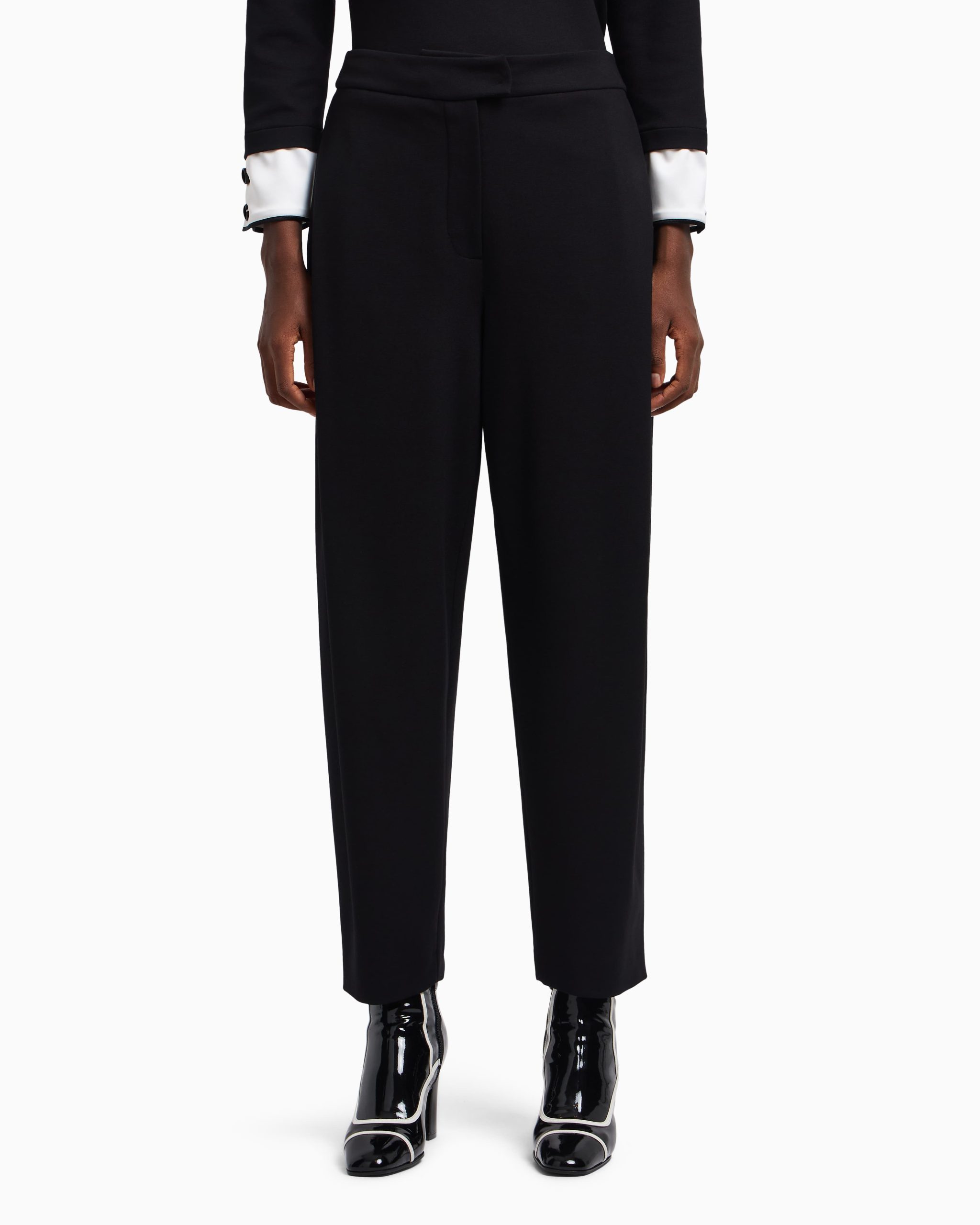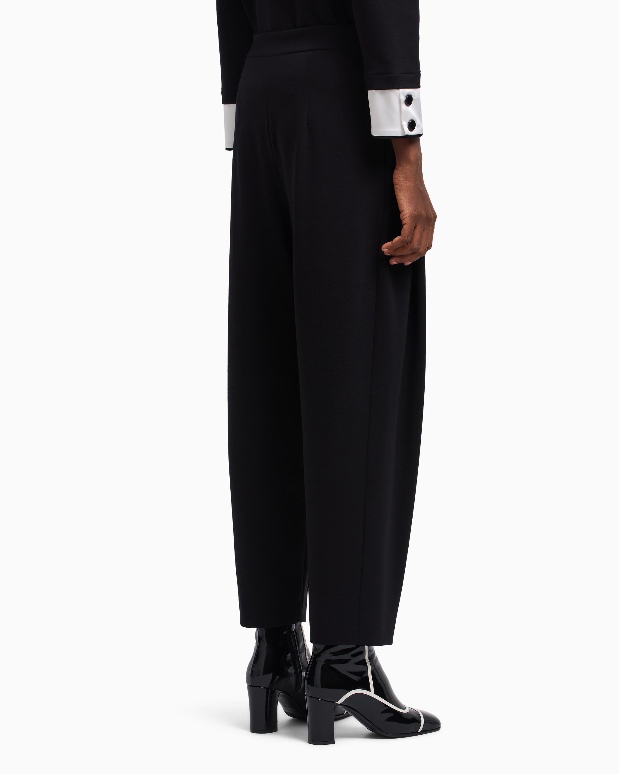 Trousers made of stretch Milano-stitch, a fabric with a texture that ensures a comfortable yet sophisticated fit. The side pleat stays fixed and enhances the leg design.