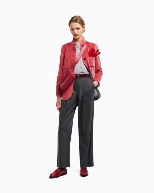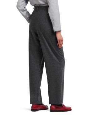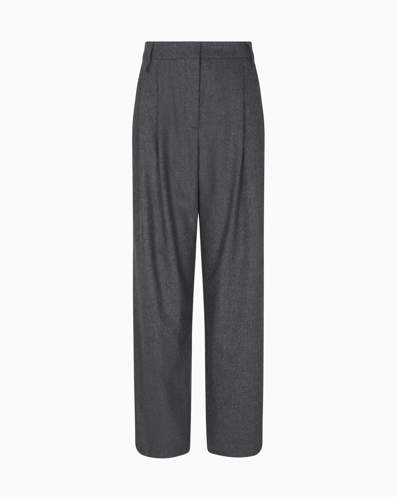 Trousers with pleats made of a virgin-wool flannel with a small percentage of cashmere that enhances its smooth feel. The pleats create a sophisticated vertical crease along the wide leg. The garment is part of the Icon capsule collection.