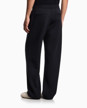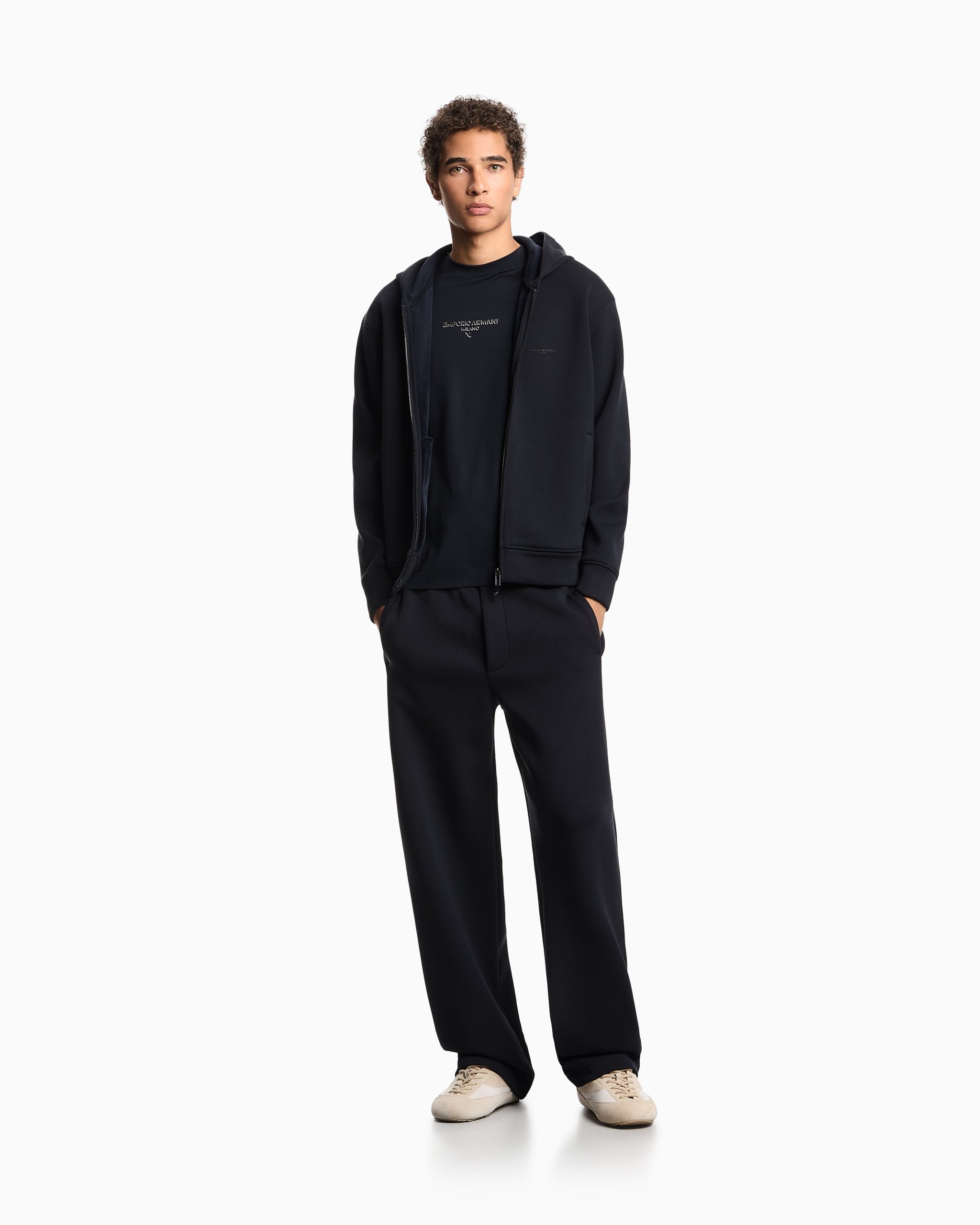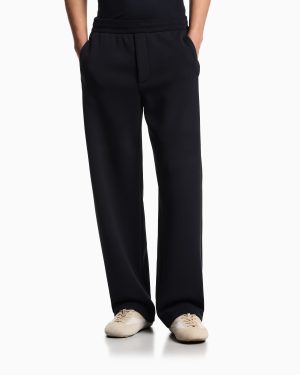 Joggers with an internal drawstring at the waist, made of bonded fabric with cosy jersey for the outside and warm, plush chenille on the inside. The metal EA logo plate completes the piece with understated elegance.
