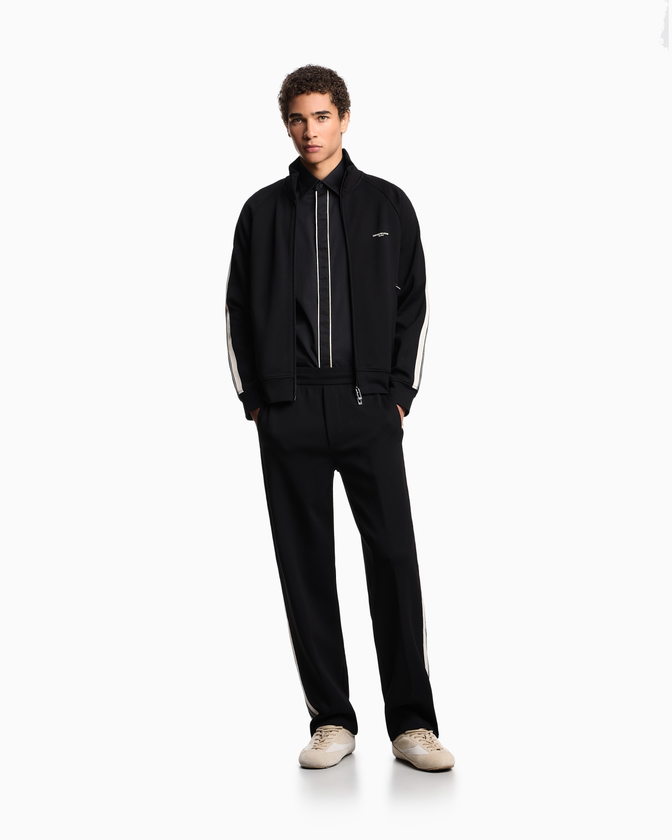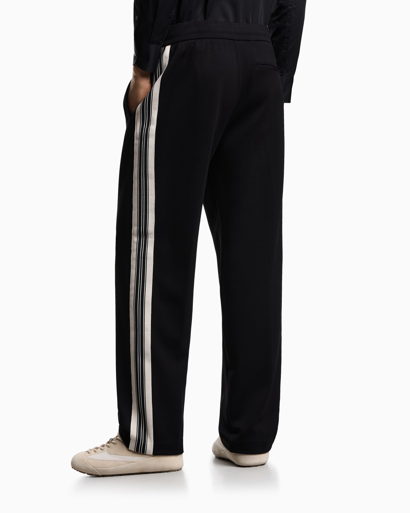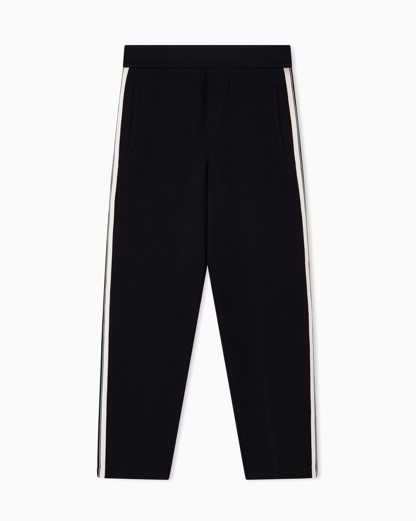 Trousers with an elasticated waist and internal drawstring, made from jersey in a cotton and modal blend. The garment is distinguished by the contrasting bands applied on the side of the leg.